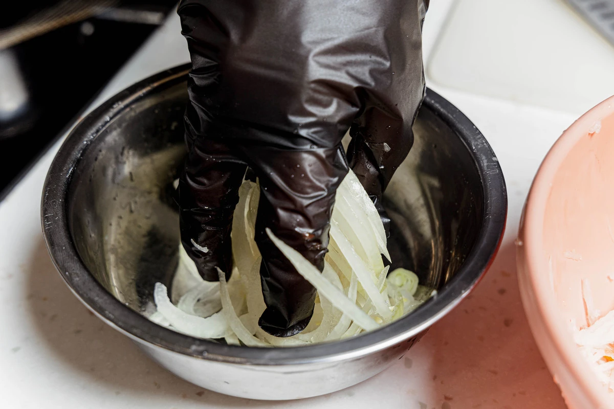 Лук нарежьте тонкими кольцами. Посолите, добавьте чуть-чуть уксуса и перемешайте.