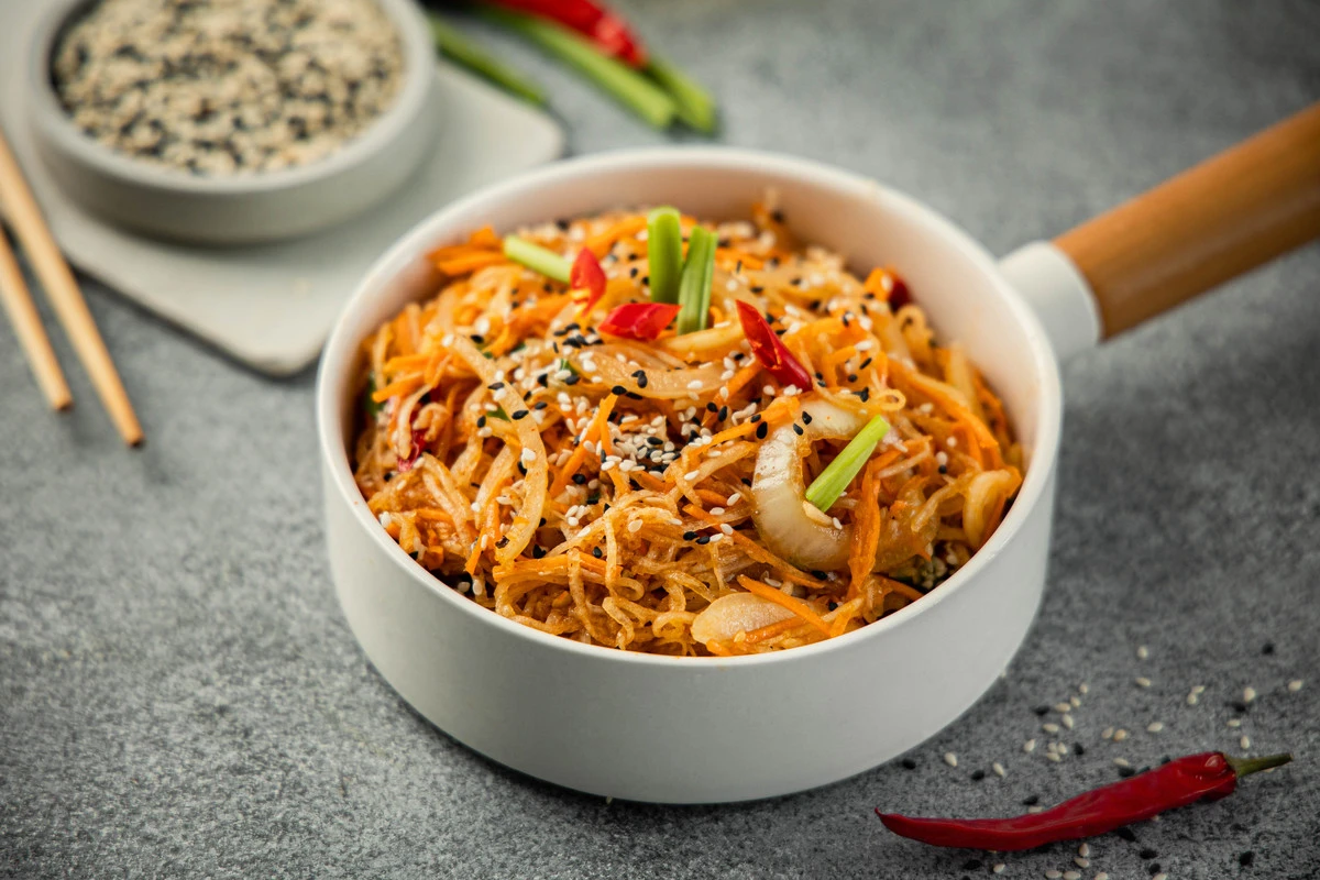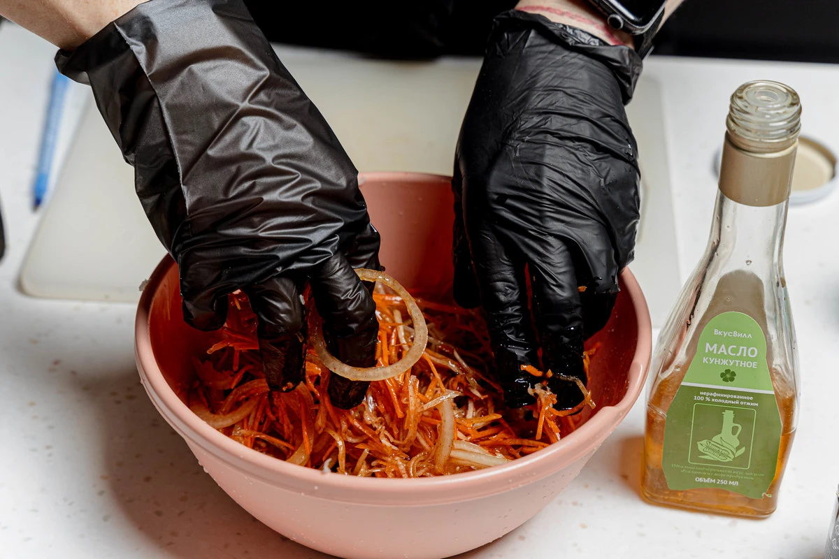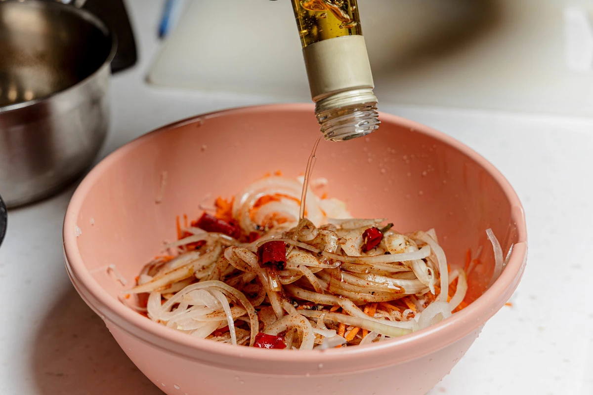 Соедините в миске дайкон, морковь и лук. Влейте заправку и кунжутное масло.