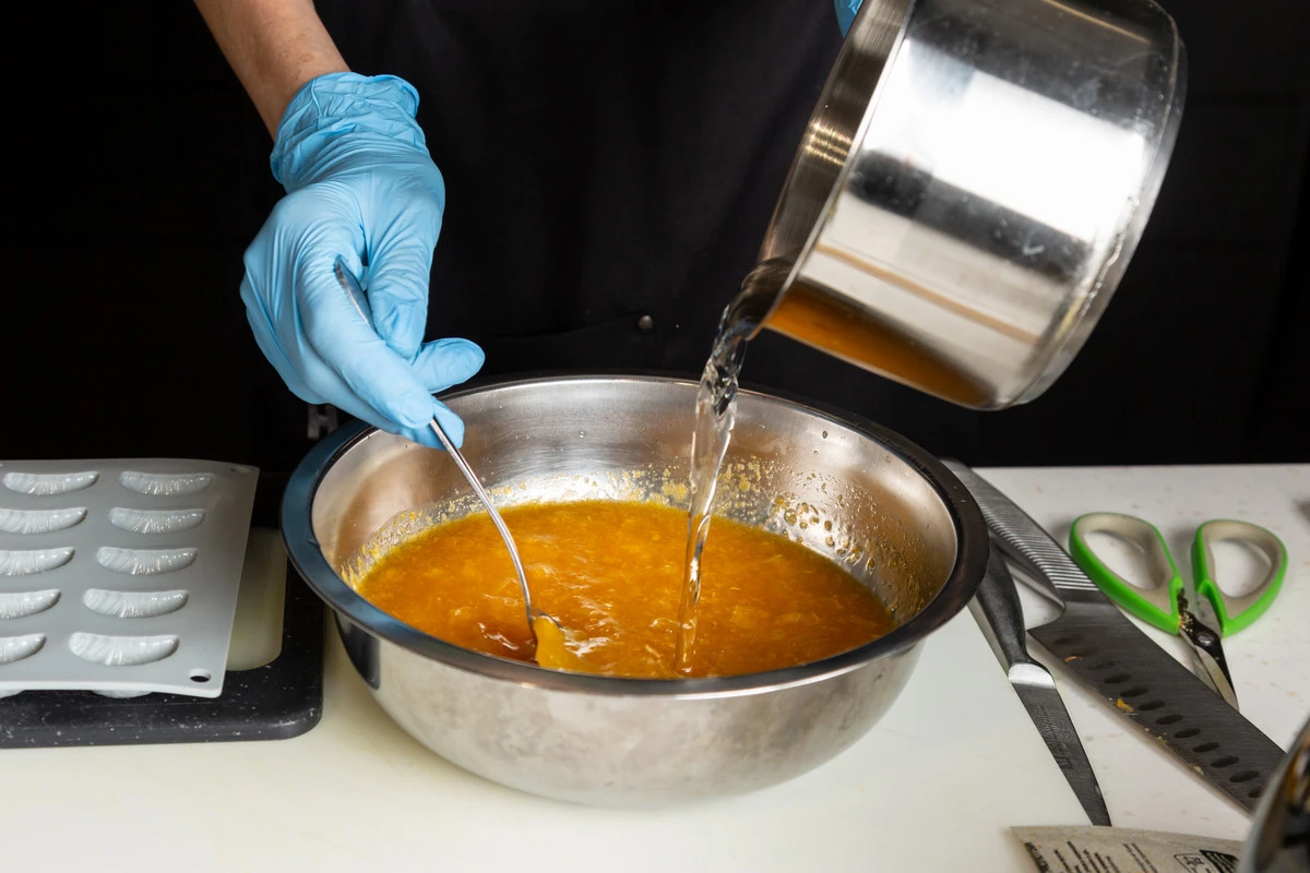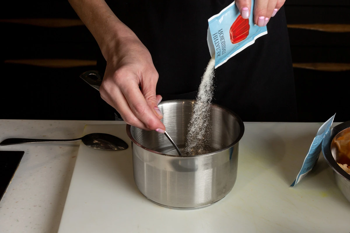 Добавьте в тёплую мандариновую массу набухший желатин и тщательно перемешайте.