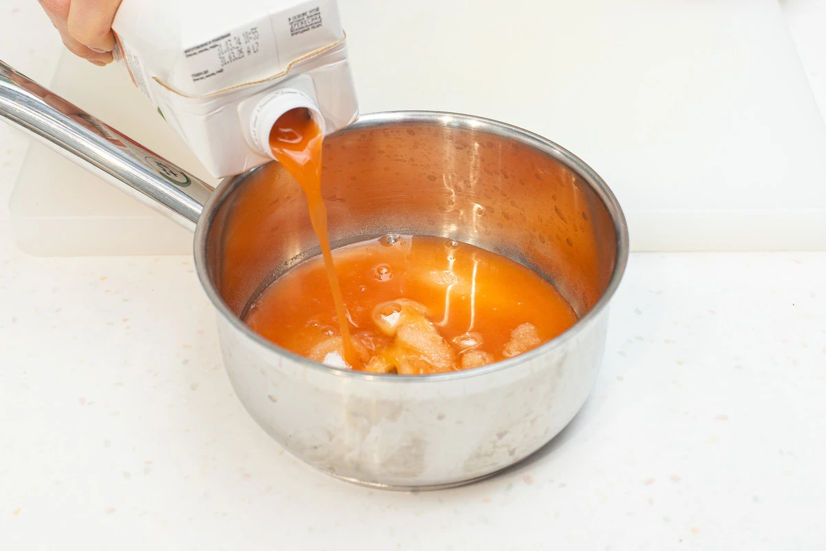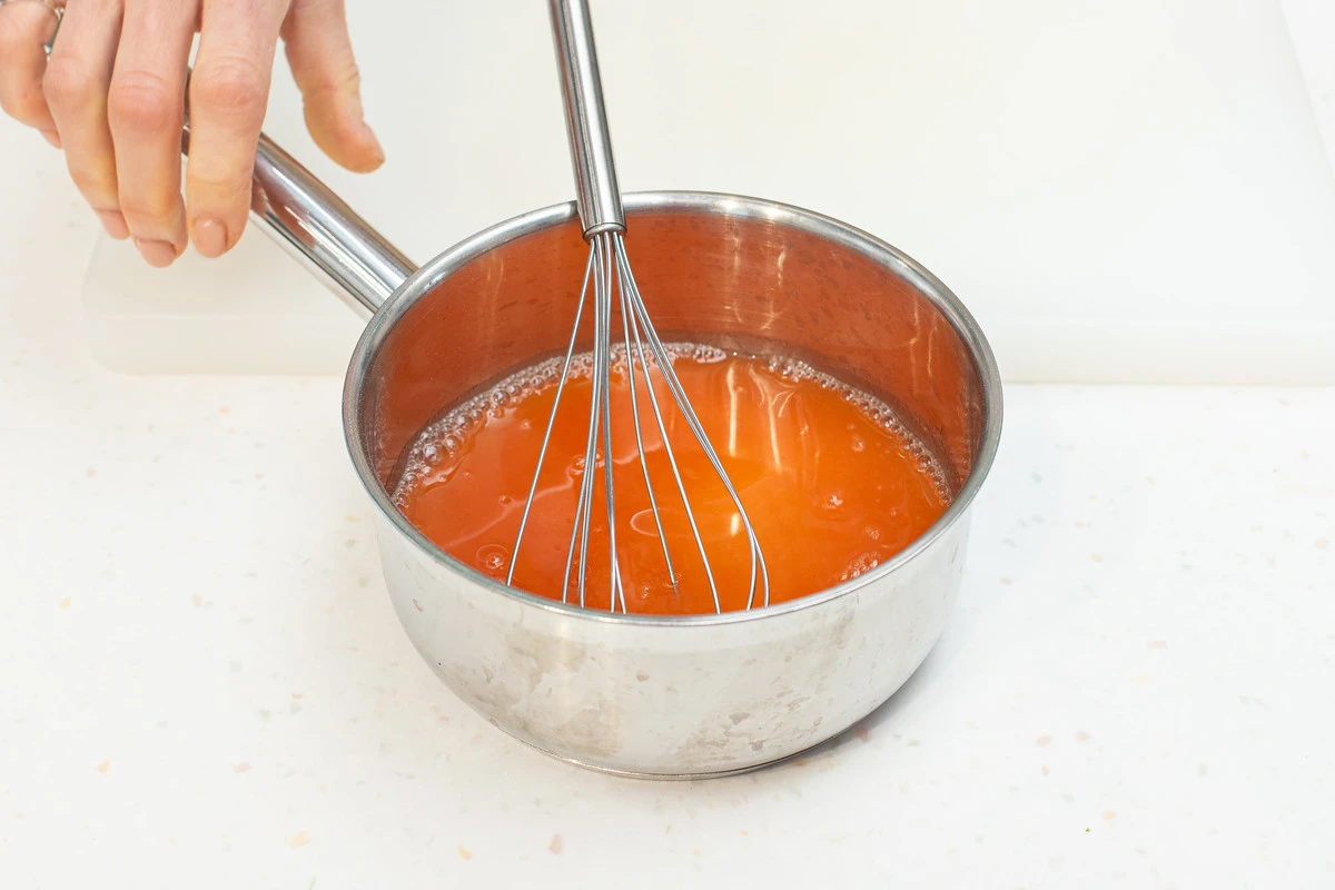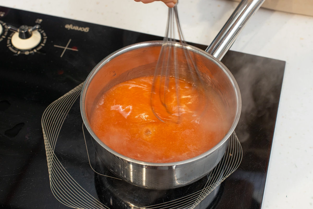 Поставьте на средний огонь. Постоянно мешая венчиком, доведите до кипения и затем варите 1-2 минуты. Смесь должна загустеть.