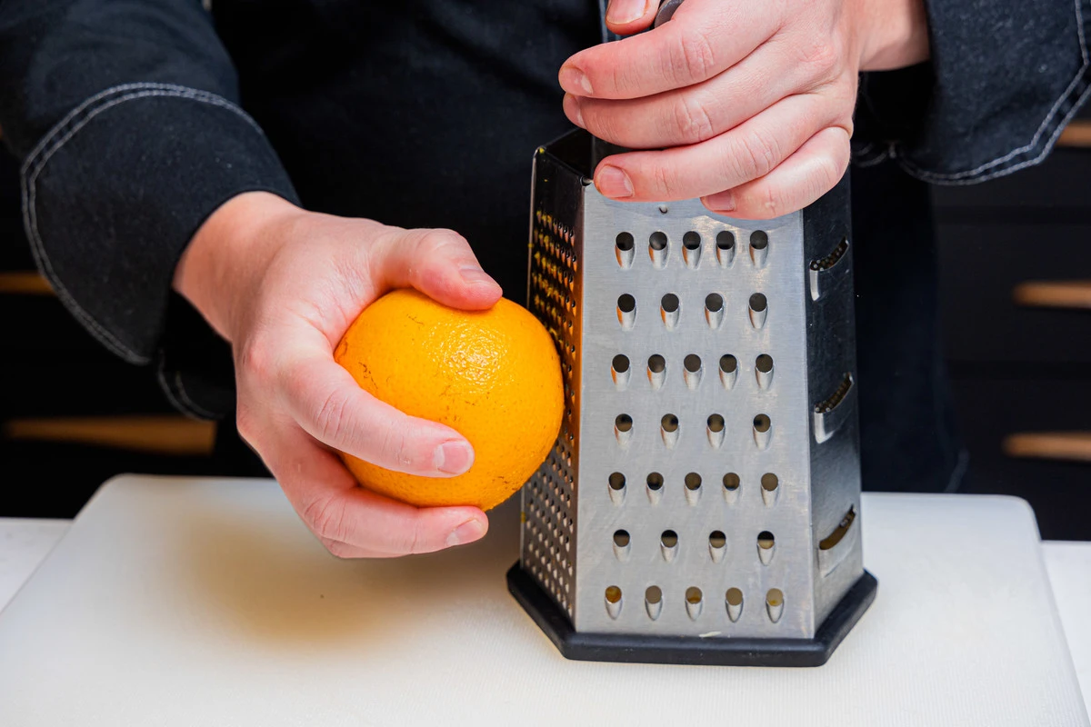 С апельсина снимите цедру — это можно сделать на мелкой тёрке, если нет специального ножа.