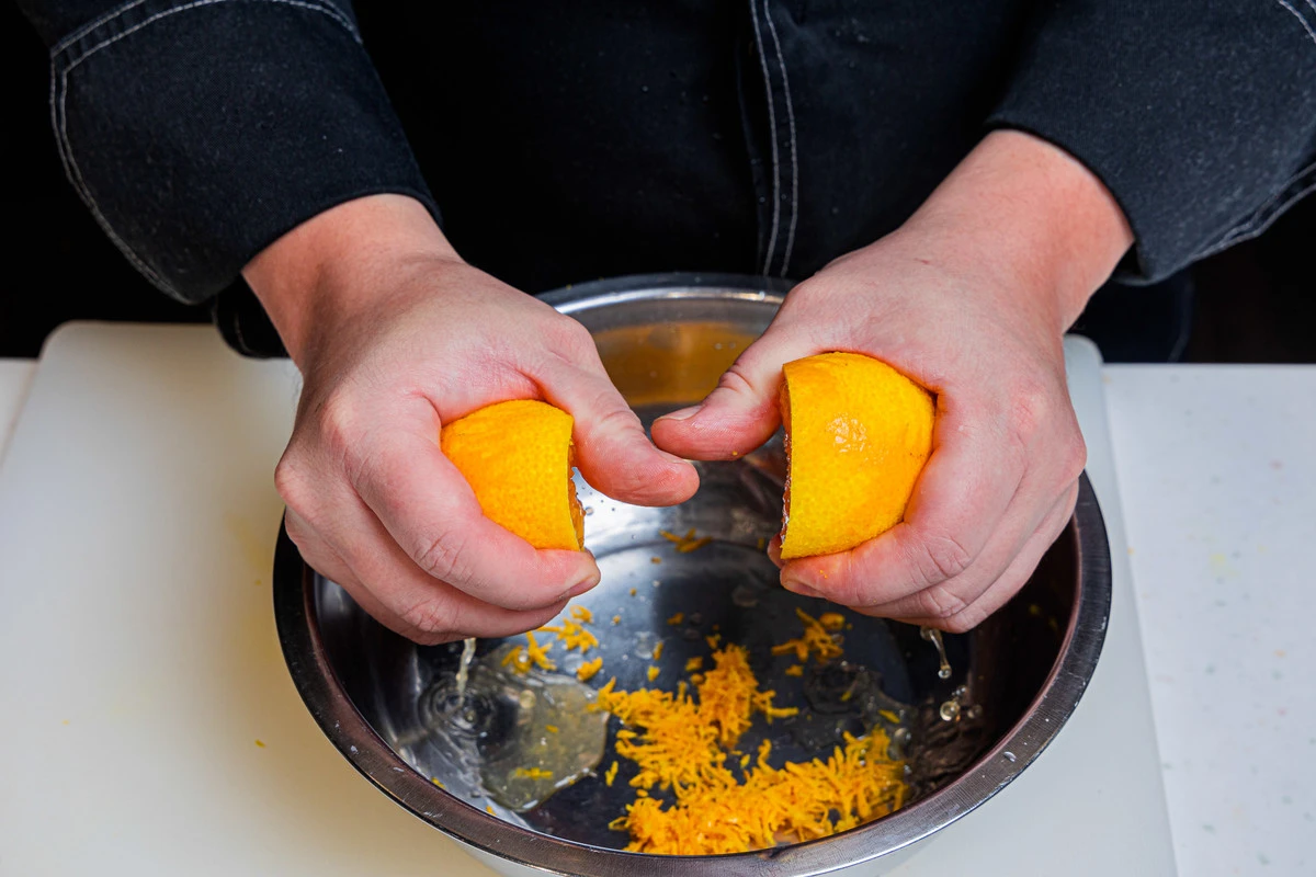 Положите цедру в миску, туда же выжмите сок из апельсина.