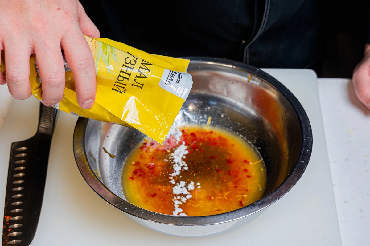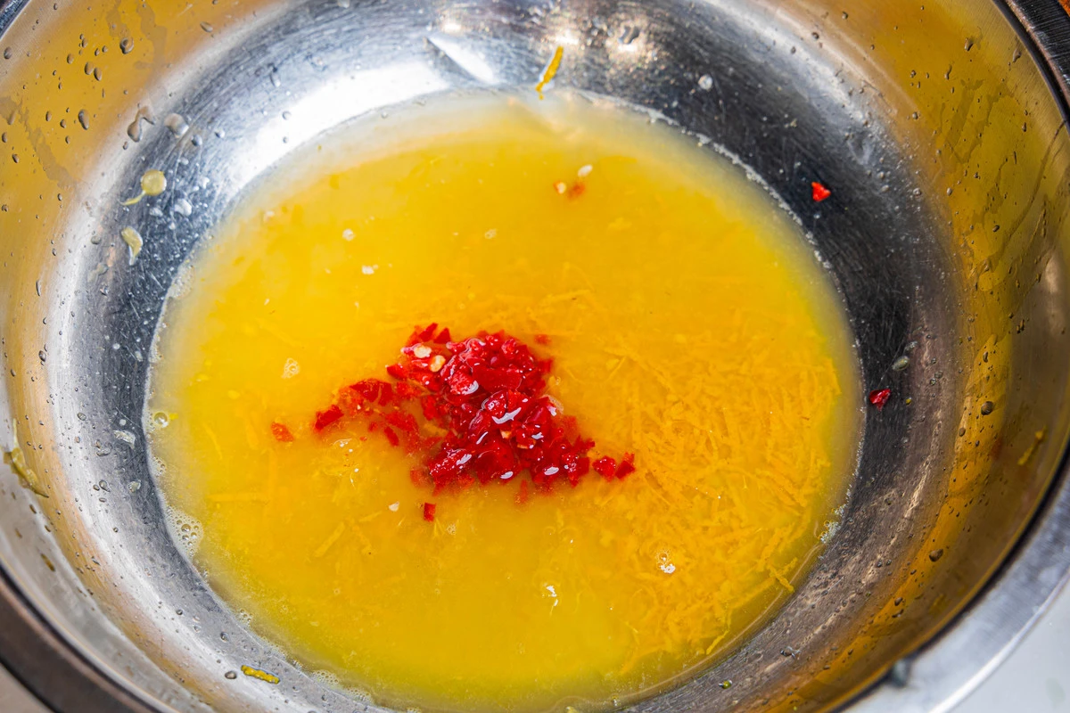 Перец чили очистите от семян, мелко нарежьте и положите в миску с соком и цедрой.