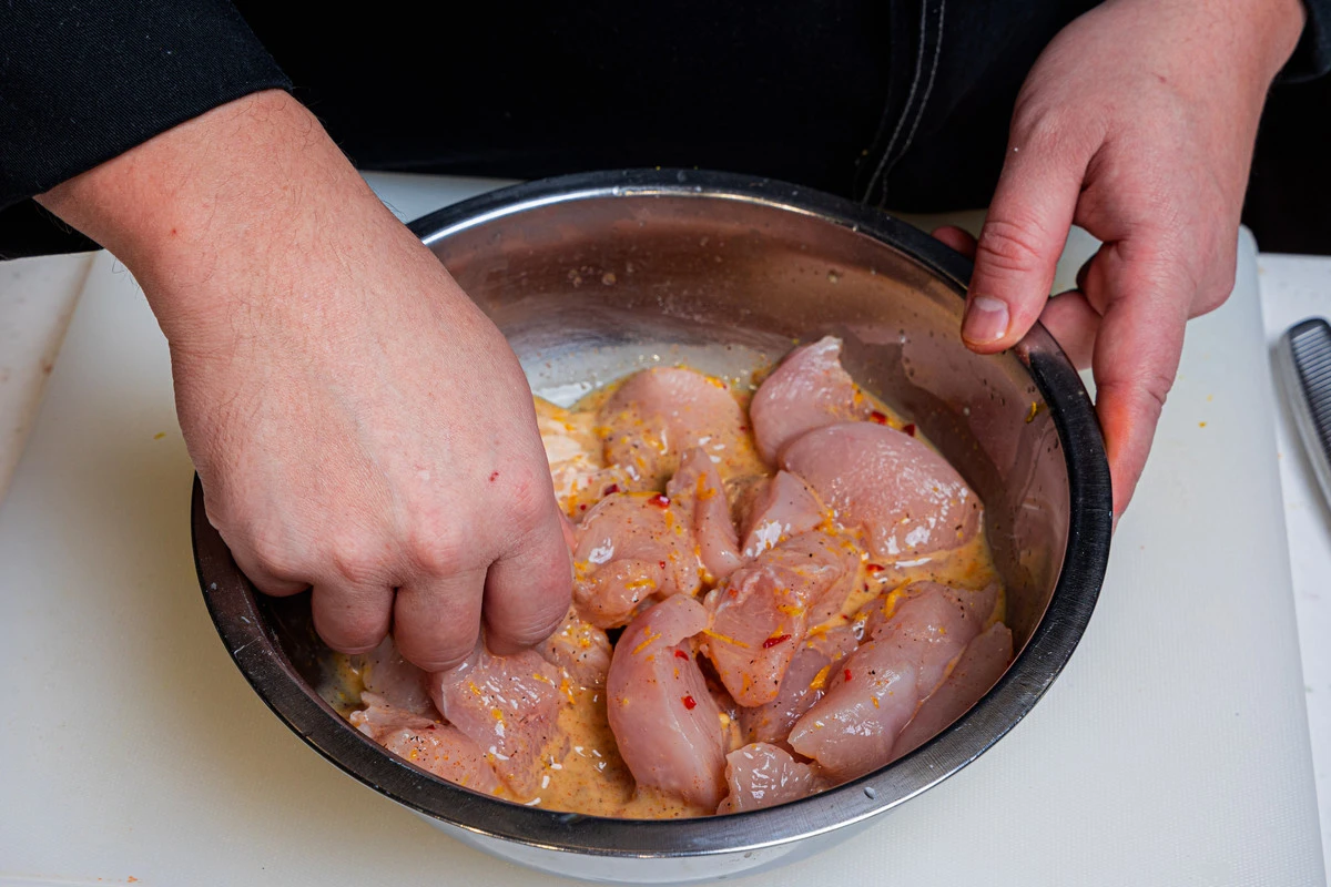 Положите медальоны из цыплёнка в получившийся маринад, хорошо перемешайте и уберите на 2 часа в холод.