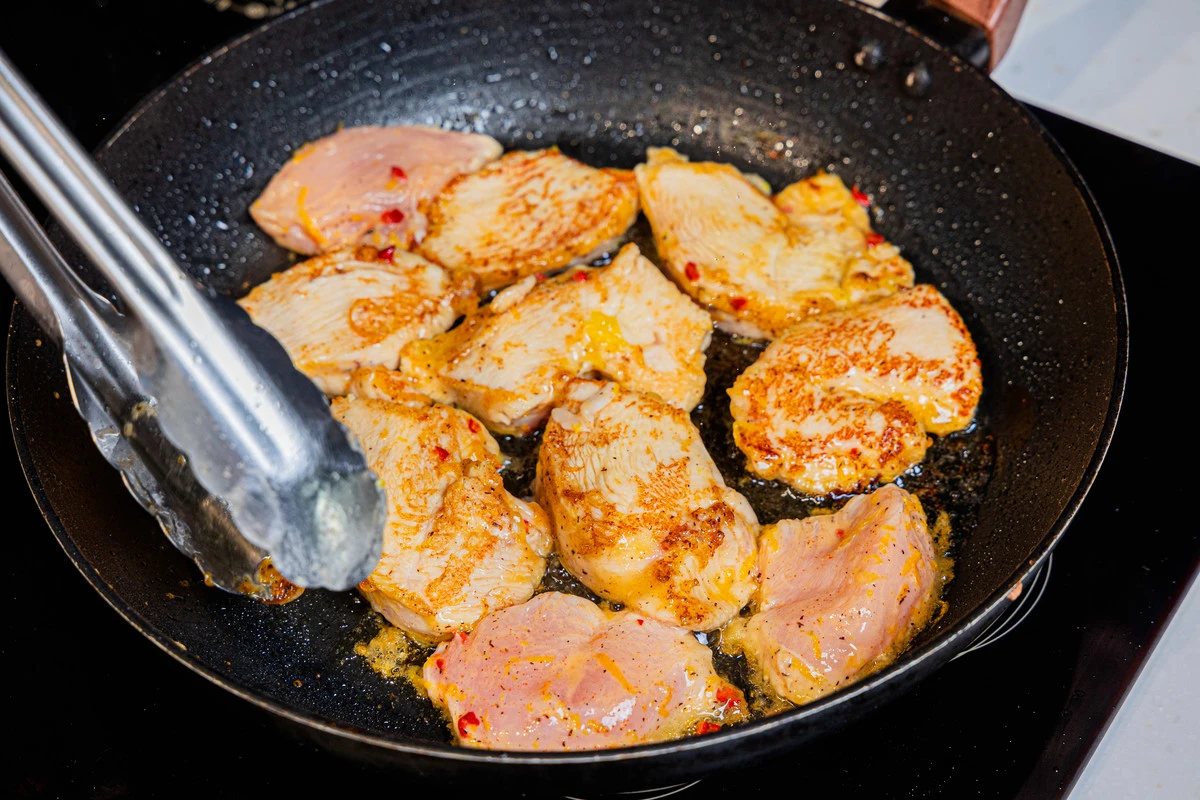 Разогрейте сковороду с растительным маслом. Готовьте курицу на среднем огне примерно по 2 минуты с каждой стороны.