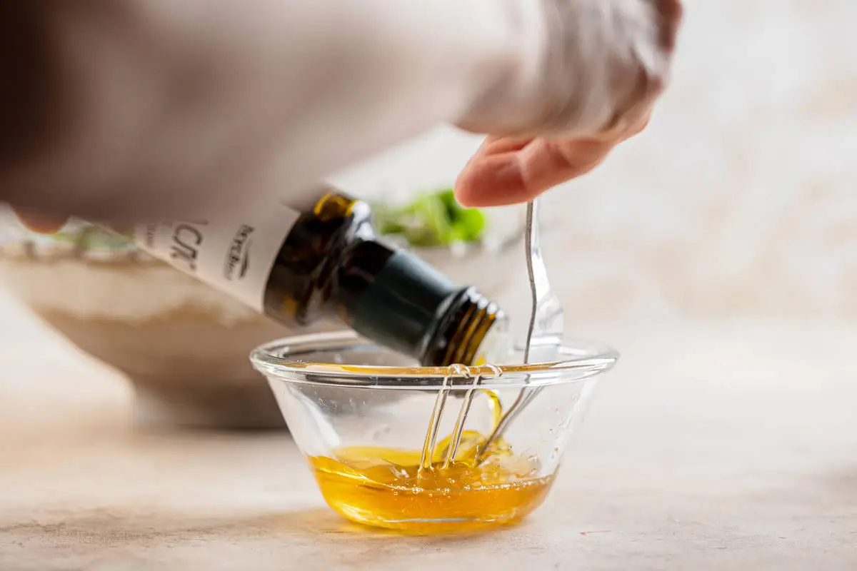 Смешайте мёд, оливковое масло и сок лимона, взбейте вилкой.