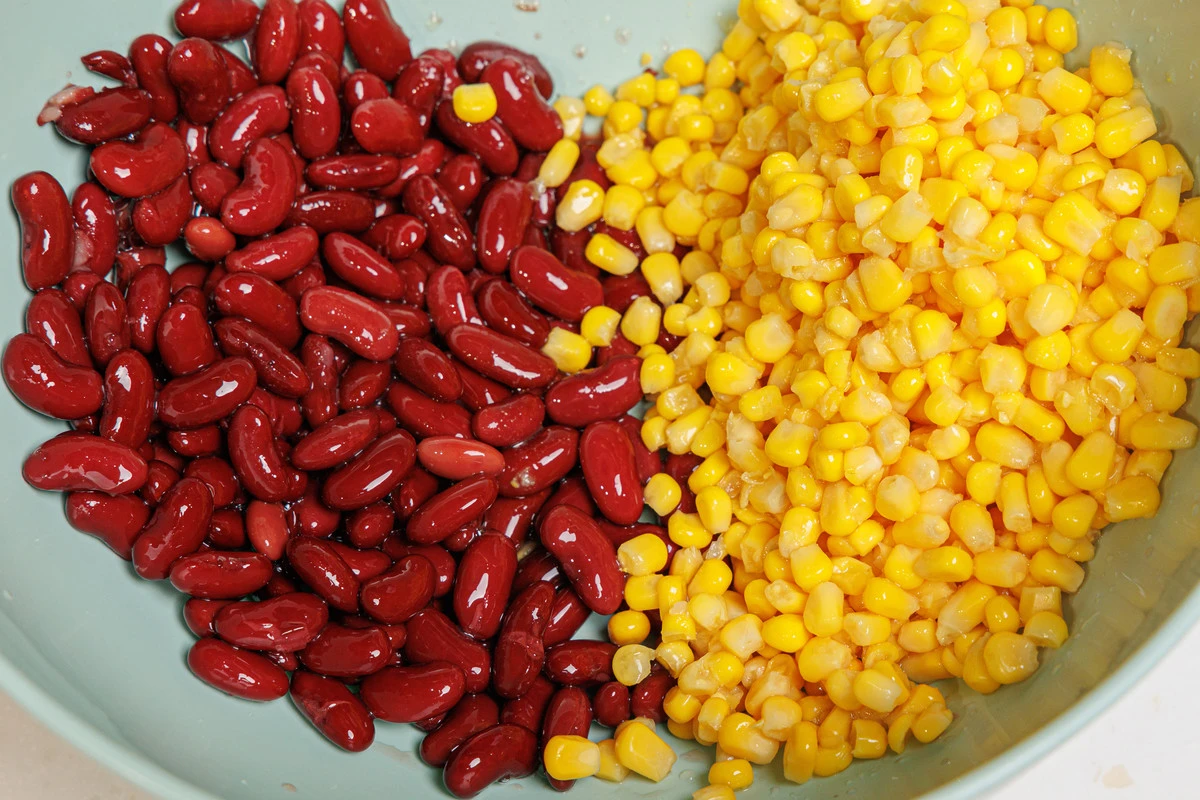 С фасоли и кукурузы слейте жидкость, выложите в миску.