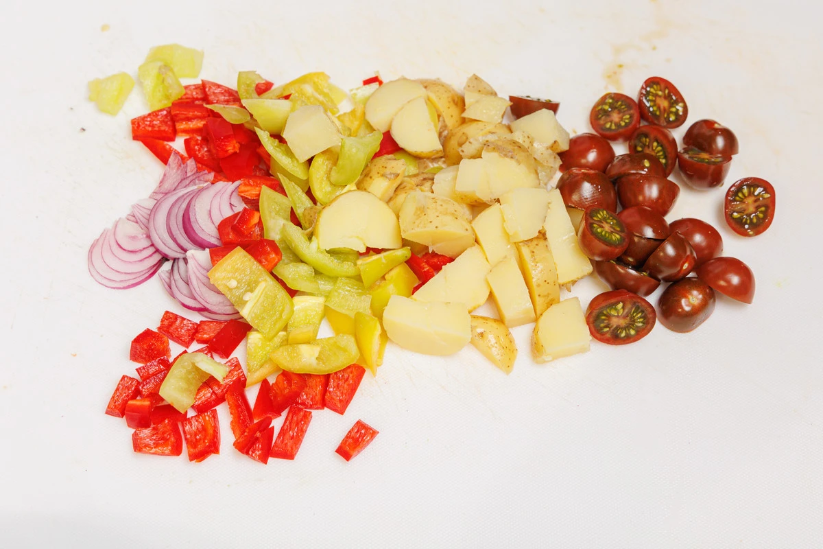 Перец нарежьте кубиками, лук — перьями, картофель — крупно, прямо с кожурой, черри — пополам.