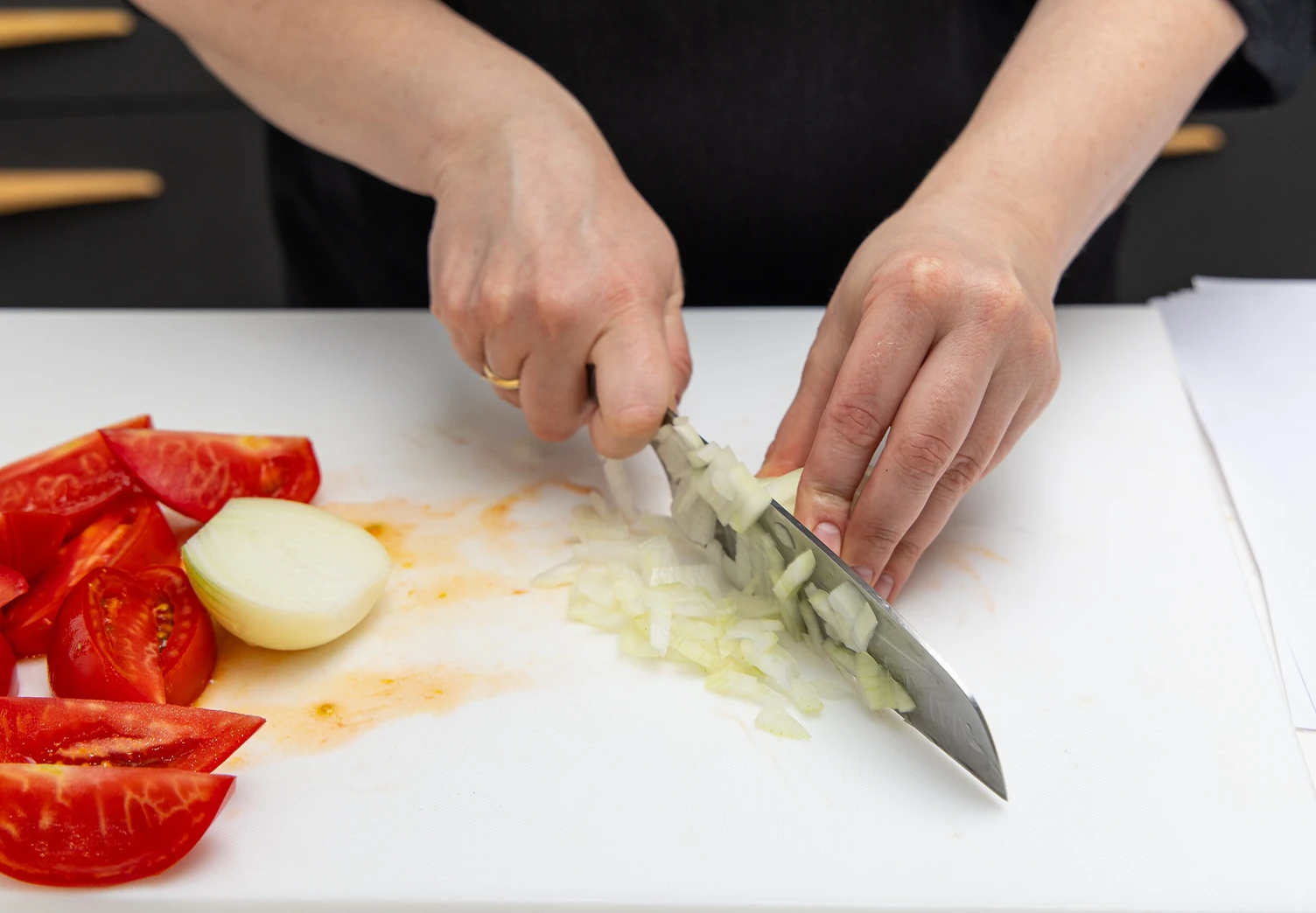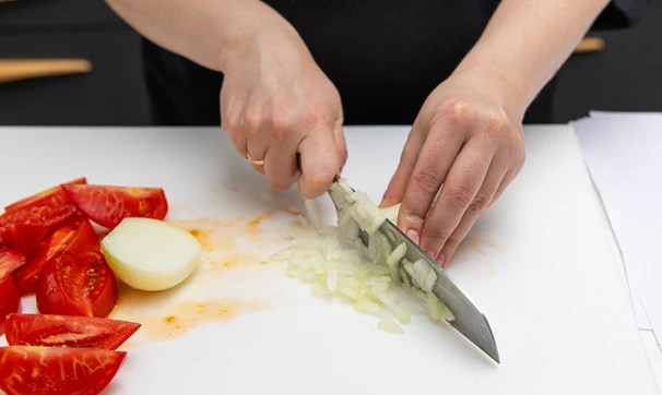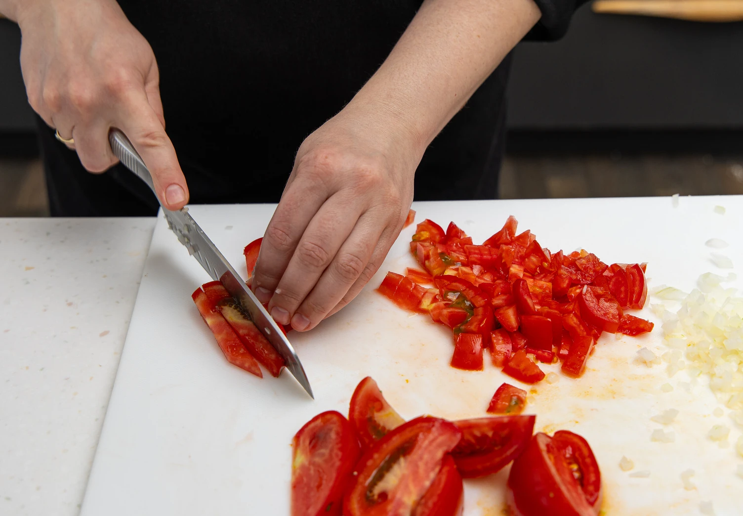 Нарежьте помидоры небольшими кубиками. По желанию их можно обдать кипятком и очистить от кожицы.