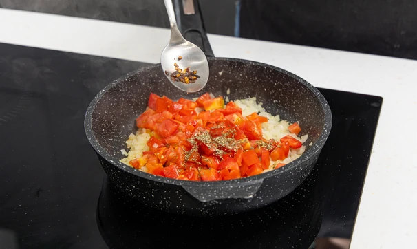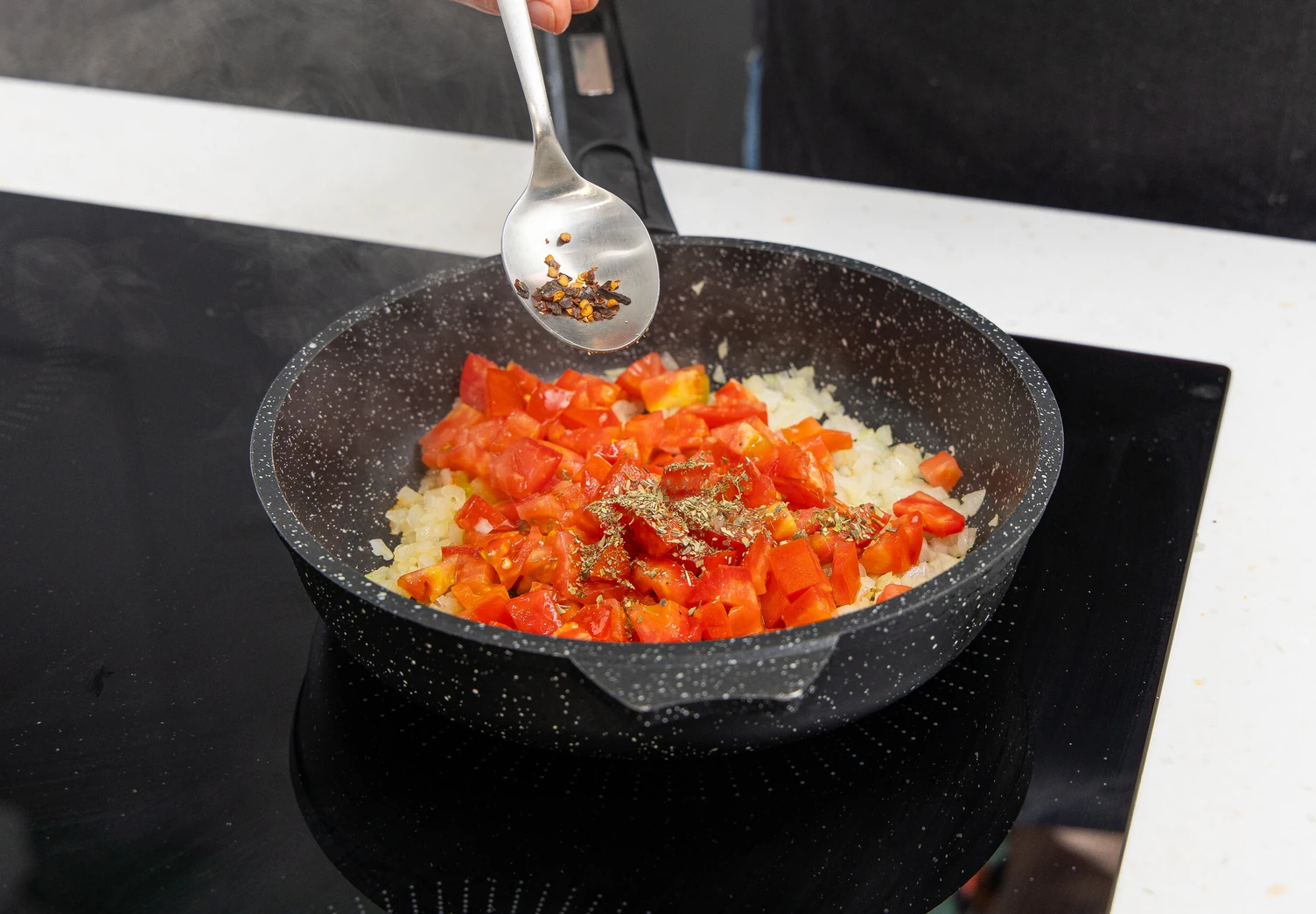 Добавьте перец, помидоры, хлопья чили и орегано, посолите по вкусу. Тушите на среднем огне 7–8 минут.