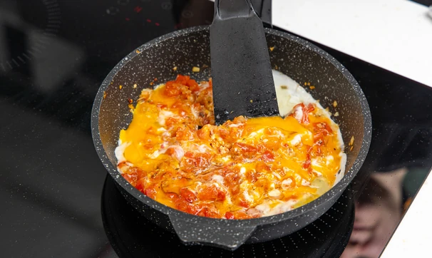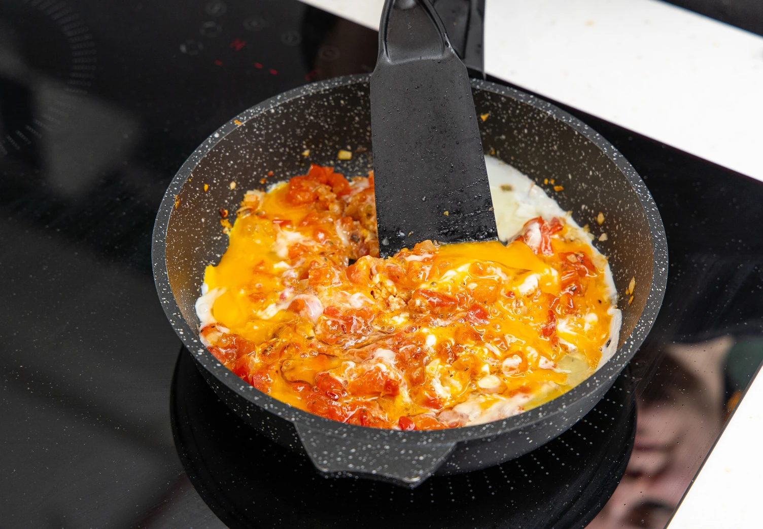 Разбейте в сковороду с овощами яйца и слегка помешайте их лопаткой, чтобы разрушить желтки.