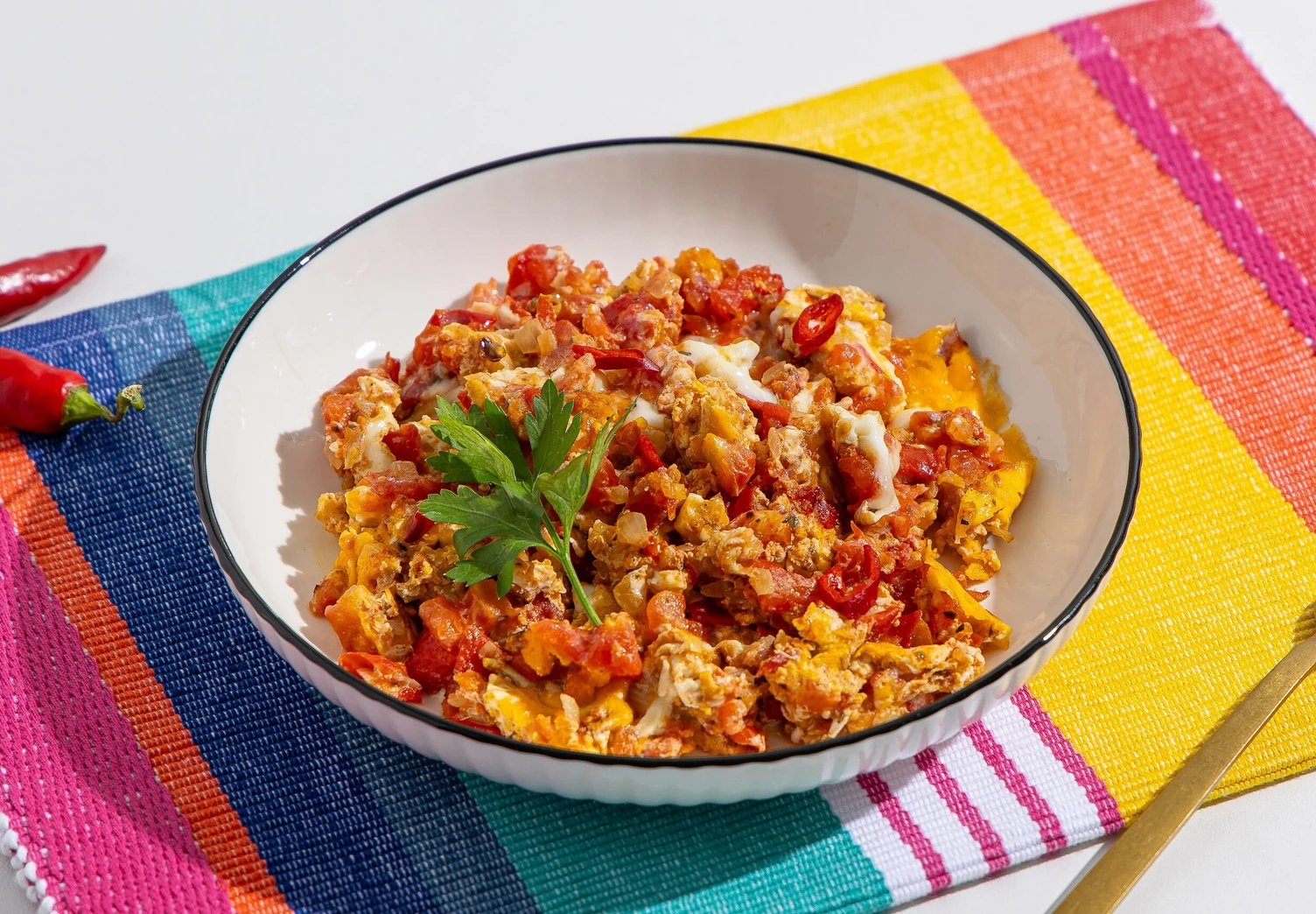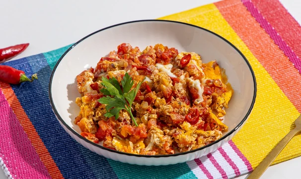 Начинаем знакомство с менемена — традиционного турецкого завтрака с яйцами и овощами. Дополните его щедрой ложкой йогурта и тёплой лепёшкой, и утро точно станет добрым.
