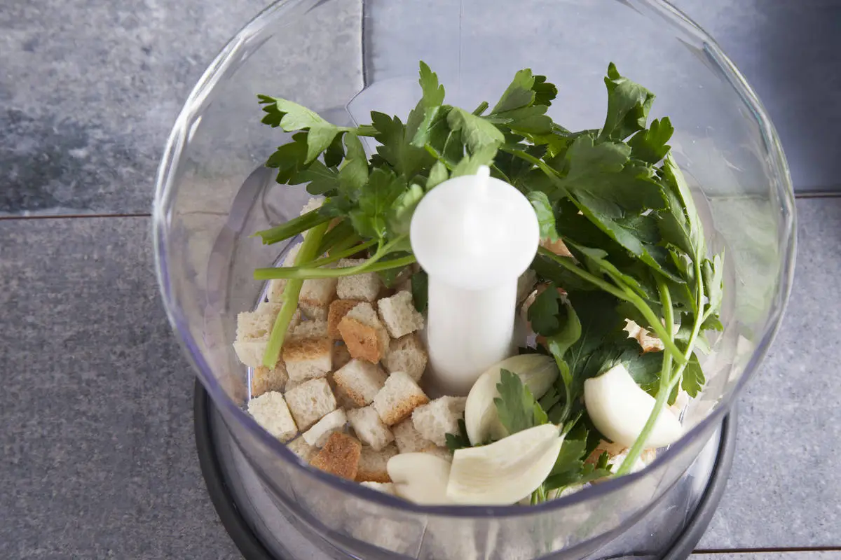 Горсть сухариков, листья петрушки и цедру с половинки лимона (снимайте только желтую часть) пробейте в блендере до однородной крошки, посолите, поперчите по вкусу и перемешайте с оливковым маслом так, чтобы получилась достаточно густая масса.