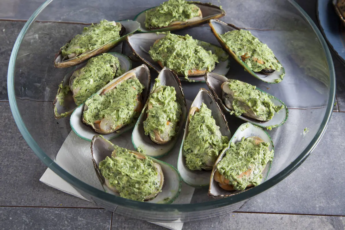 Сливочное масло пробейте в блендере вместе с травами и чесноком, получившейся смесью нафаршируйте мидии.