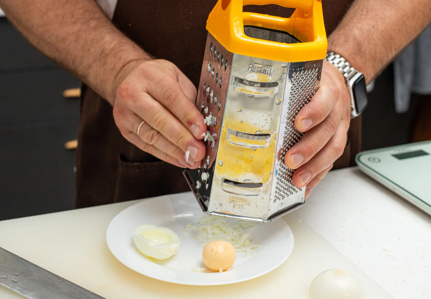 Яйца отварите вкрутую, отделите белки от желтков и натрите на терке по отдельности.