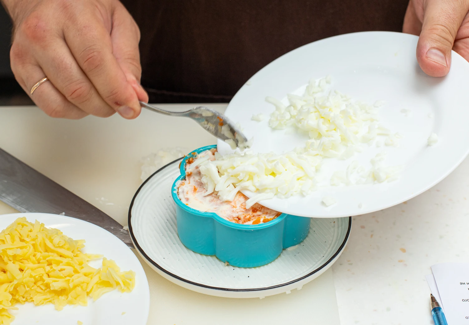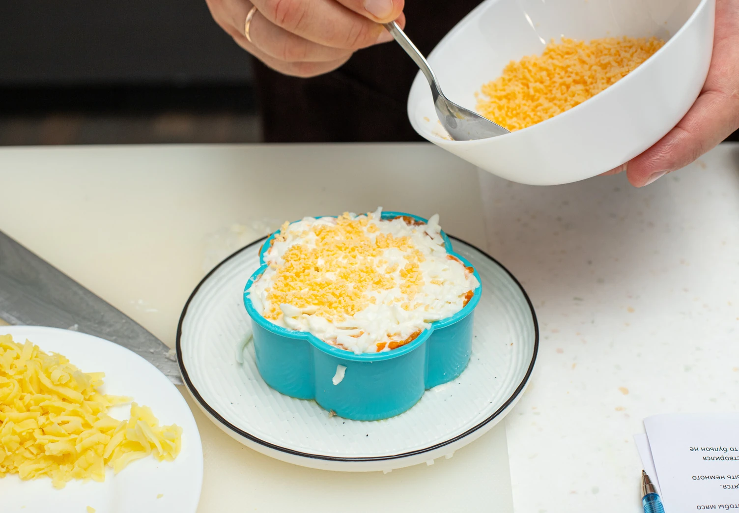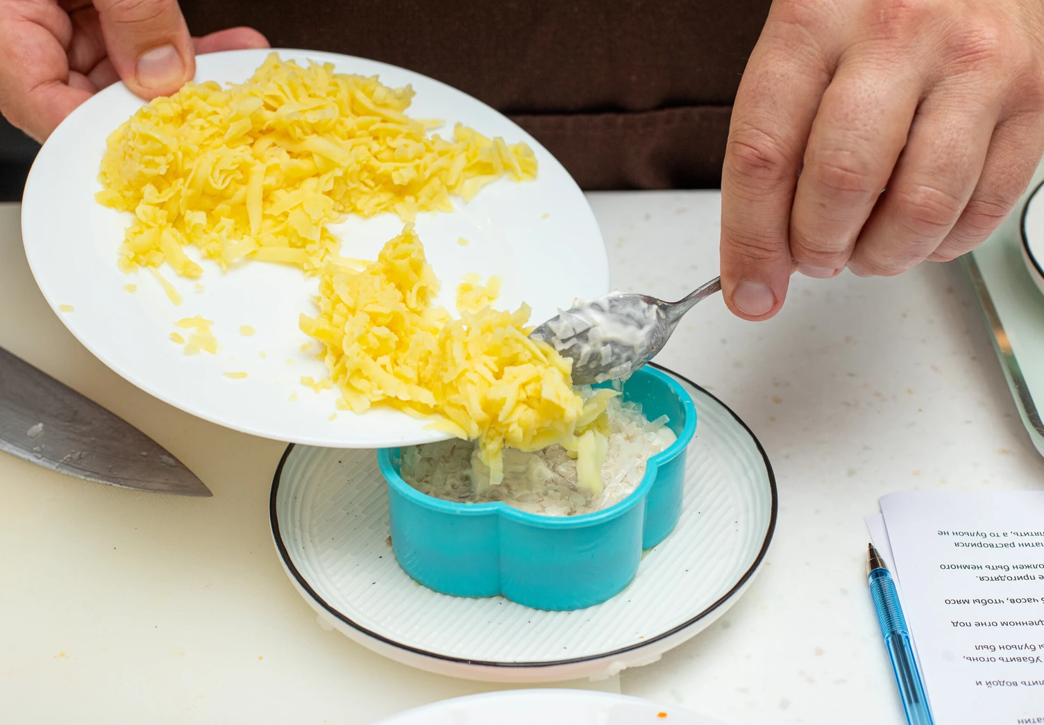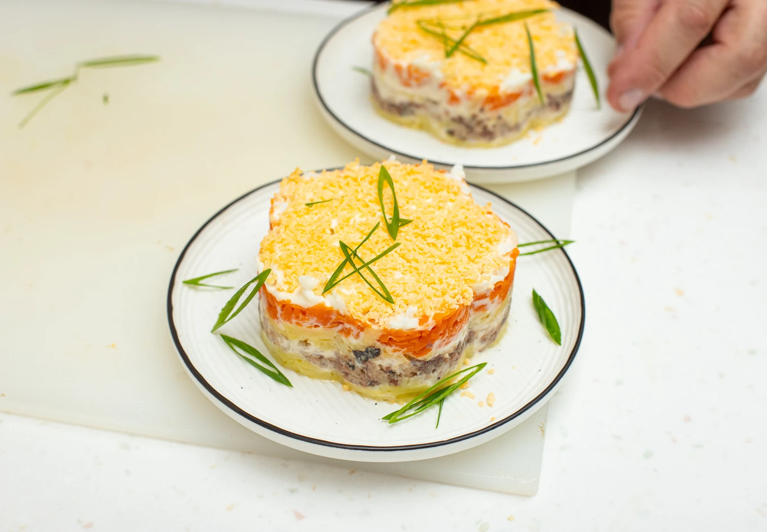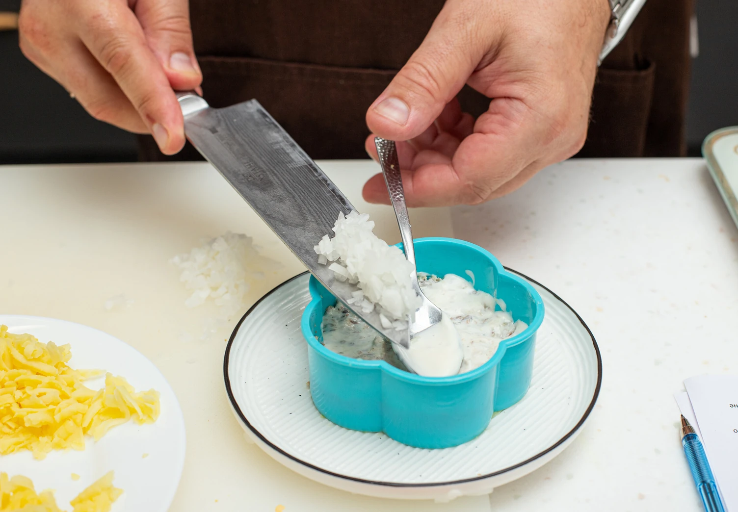 Третий слой — рубленый лук. Если используете обычный репчатый, ошпарьте его кипятком, чтобы убрать горечь.