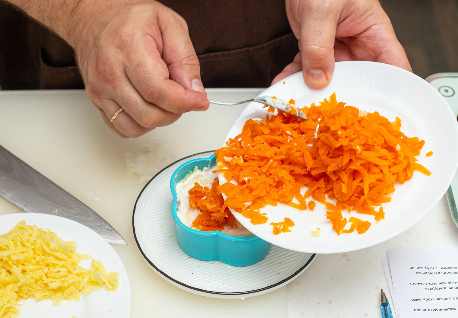 Пятый слой — тёртая на средней тёрке морковь и майонез.