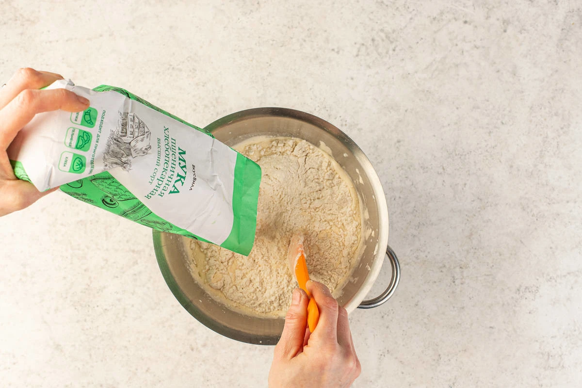 Всыпьте просеянную муку небольшими порциями и вмешайте в тесто, чтобы оно получилось достаточно густым, но ещё липким. Тогда куличи будут воздушными.