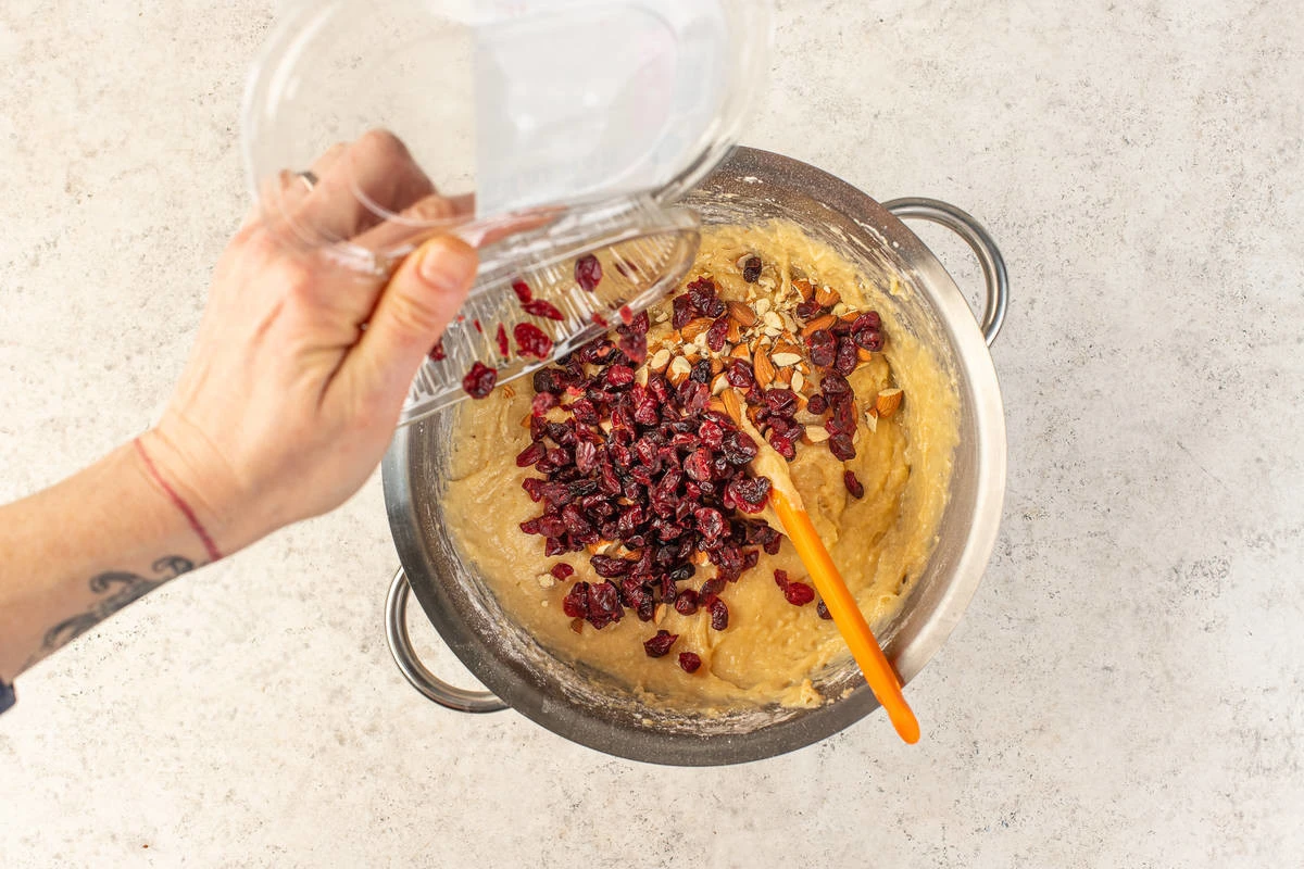 Тщательно вымесите тесто лопаткой, добавьте мускатный орех, рубленые орехи и клюкву, перемешайте и оставьте в тёплом месте на 30-40 минут.