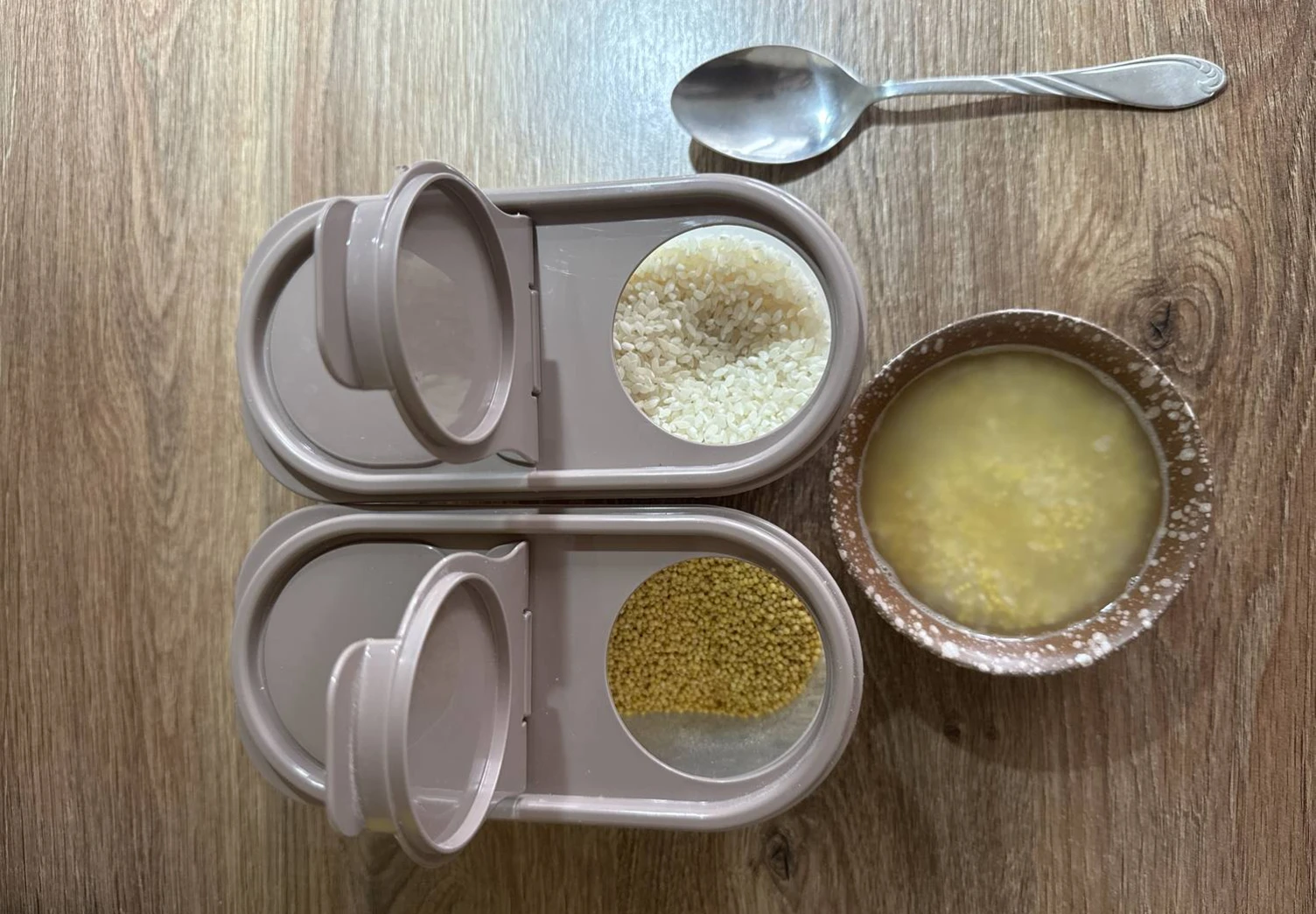 В миске смешать 2 ст. ложки пшена и 2 ст. ложки риса. Залить кипятком, чтобы у пшена ушла горечь. Затем несколько раз помыть смесь под водой.
