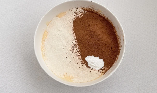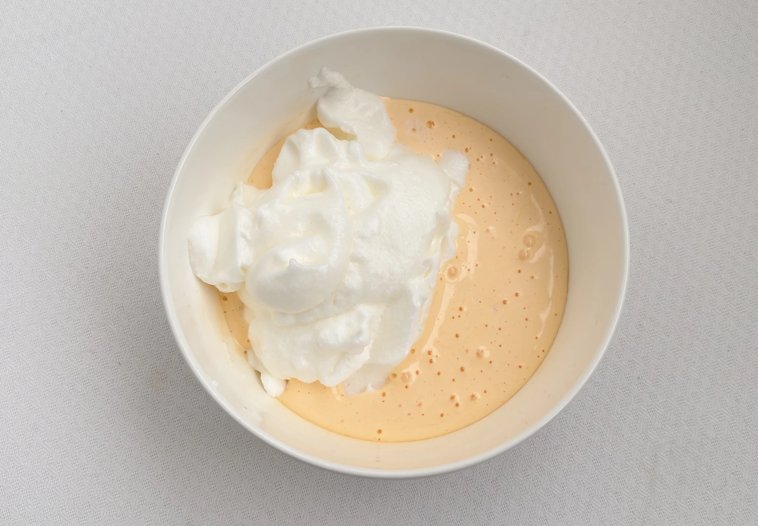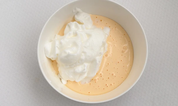 В белки всыпьте оставшийся сахар и взбивайте 7–9 минут на максимальной скорости миксера, до плотных пиков. Взбитые белки добавьте в желтки.