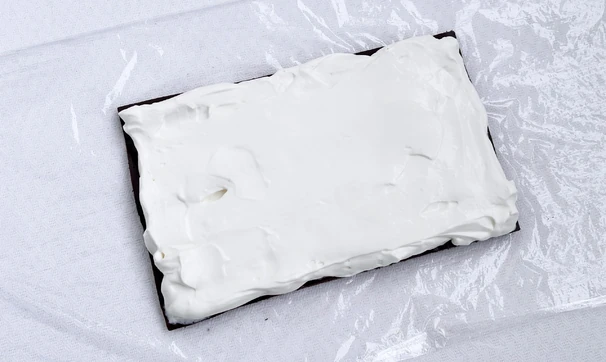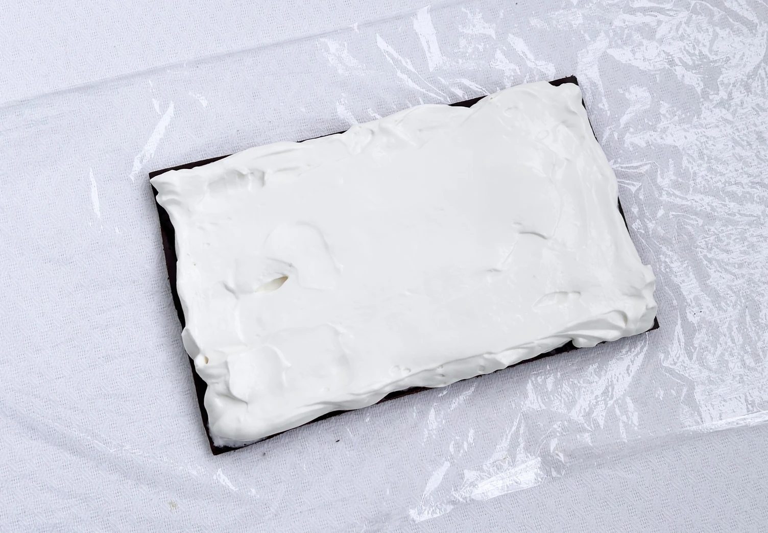 У бисквита срежьте неровные края и разрежьте пополам. Выложите бисквит на пищевую плёнку, сверху разровняйте слой суфле, а после накройте второй частью бисквита. Уберите десерт в холодильник на несколько часов для стабилизации, а затем разрежьте на порции.