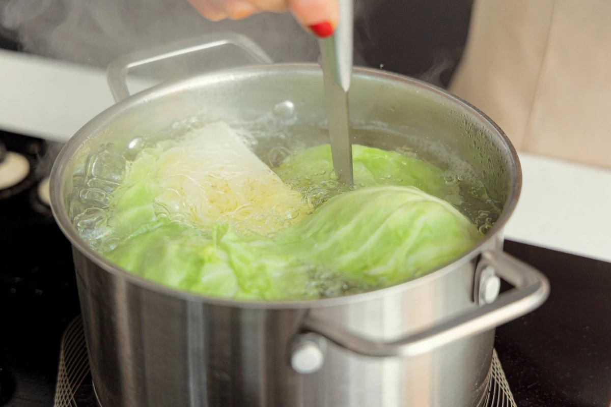 Молодую капусту разрежьте на четвертинки вдоль, сохраняя кочерыжку, чтобы листья держались вместе. Вскипятите подсоленную воду в кастрюле и отварите капусту до мягкости, это займёт 2-3 минуты.