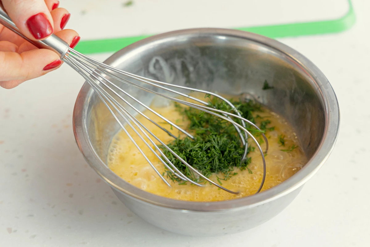 Яйца разбейте в мисочку. Смешайте яйца с укропом и взбейте вилкой.