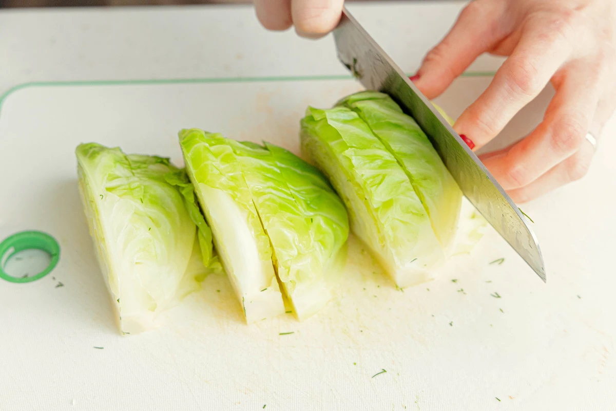 Куски капусты разрежьте на более тонкие сегменты, сохраняя серединку.