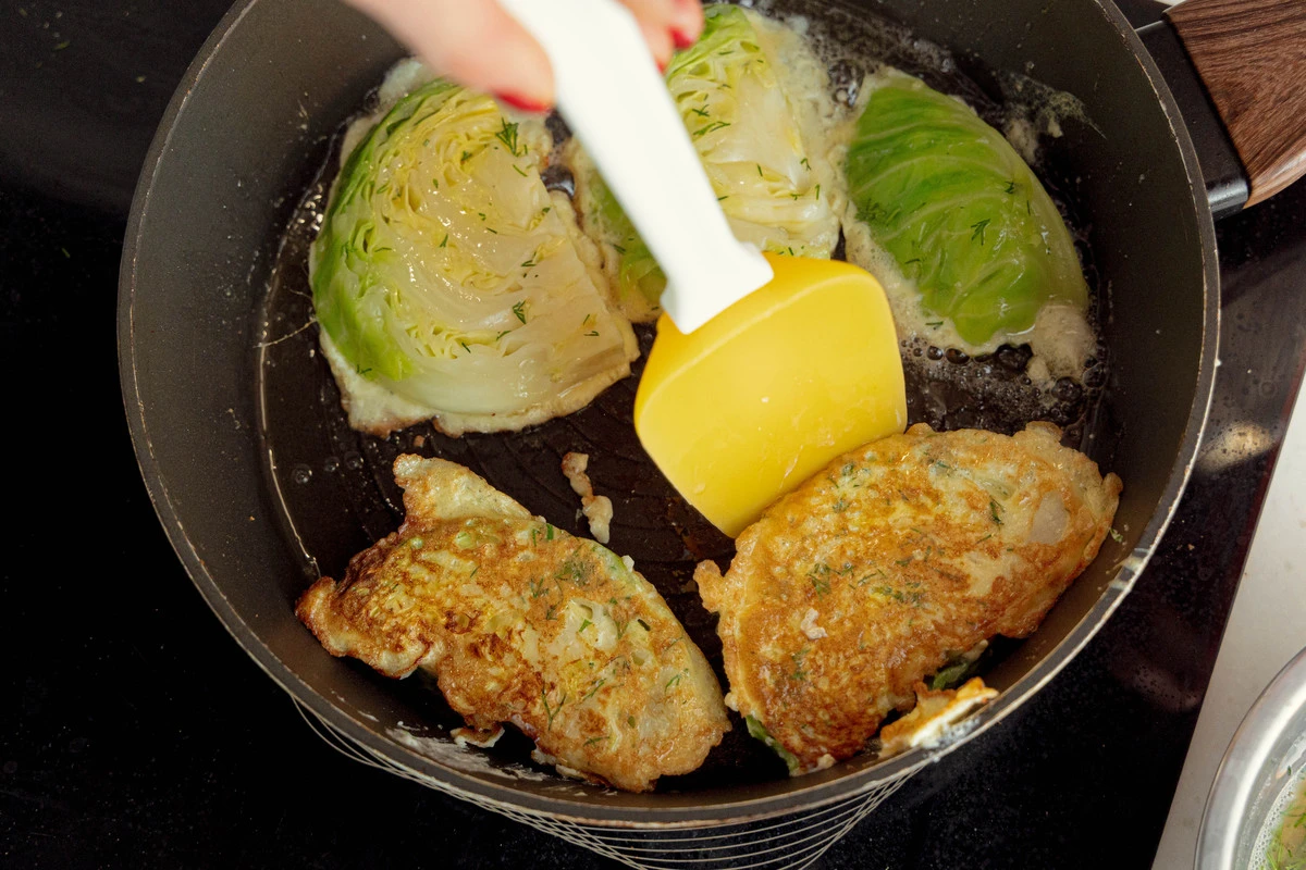 Ещё одно блюдо из детства — жареная в яйце молодая капуста. Мягкая и нежная внутри, с аппетитной корочкой снаружи.
