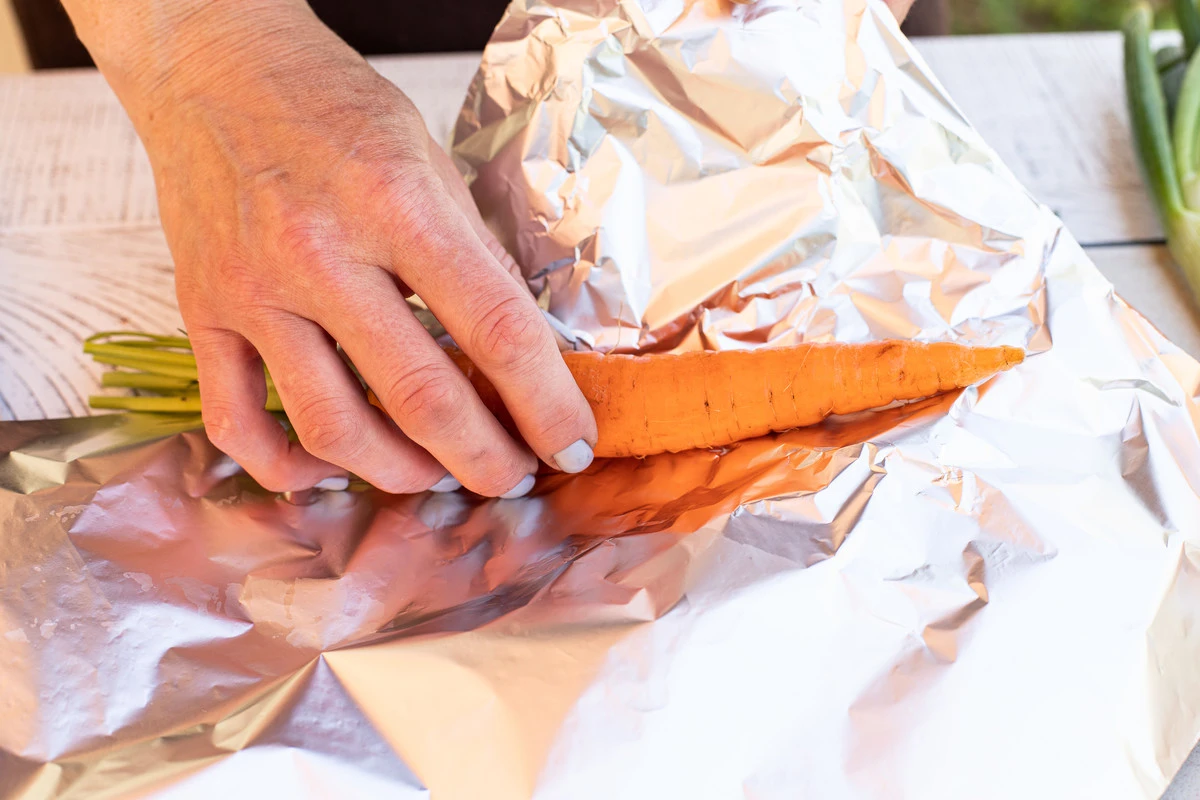 Молодую морковь помойте и заверните в фольгу, каждую по отдельности.