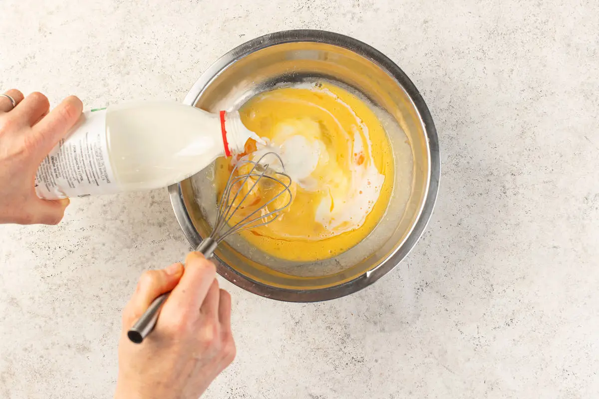 В отдельную миску вбейте яйца, добавьте муку, сахар и дрожжи. Влейте литр молока и хорошо перемешайте венчиком. Молоко желательно брать слегка тёплое, но не горячее — так дрожжи быстрее «проснутся». Полученное тесто оставьте на столе на 20 минут.