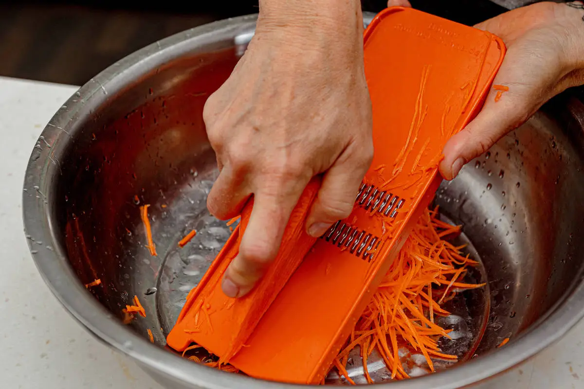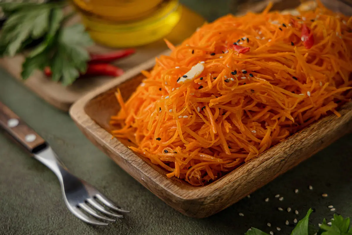 Морковь по-корейски совсем не сложно приготовить дома, понадобится только специальная тёрка и немного времени. Впрочем, можно, конечно, и нарезать морковку тоненькой соломкой — но это займёт гораздо больше времени.