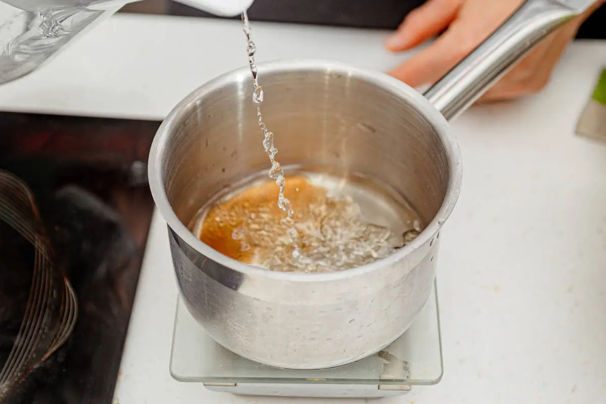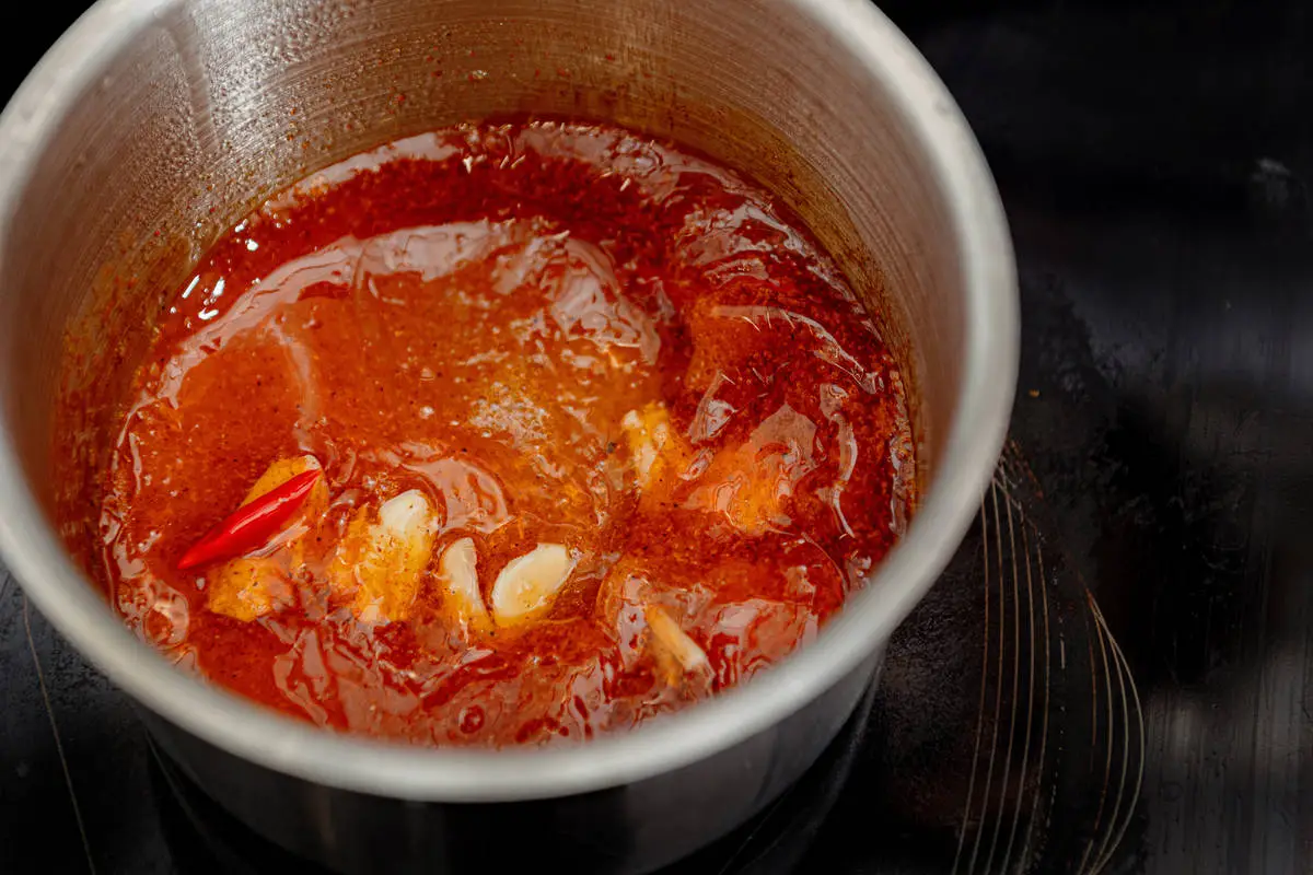 В сотейнике смешайте растительное масло и уксус, добавьте специи и измельчённый чеснок.