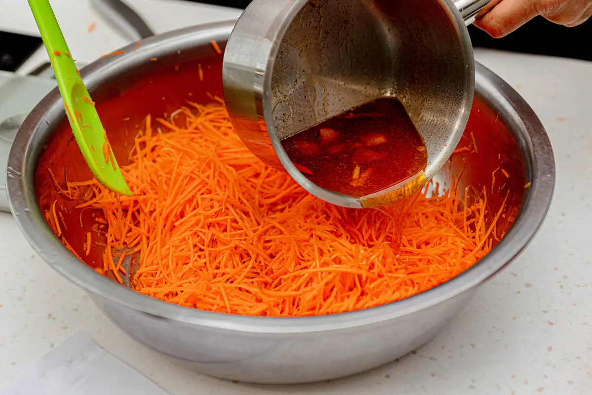 Вылейте горячую смесь на морковь. Сразу перемешайте, оставьте в контейнере остывать.