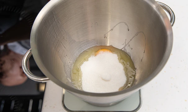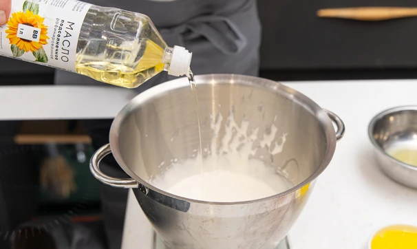 Влейте в яичную смесь растительное масло, лимонный сок и растопленное сливочное масло.