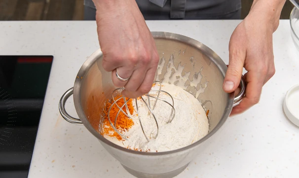 Добавьте морковь и сыпучие ингредиенты, перемешайте до однородности.