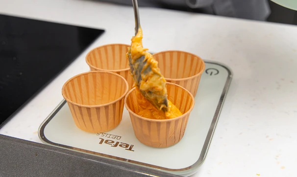 Выложите тесто (по 60 г) в формочки и поставьте в духовку, разогретую до 190 °C, на 20 минут.