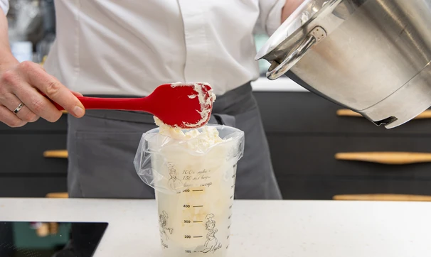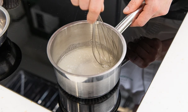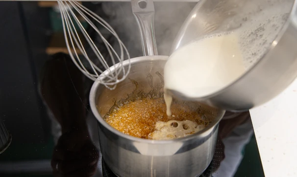 Доведите сливки до кипения и аккуратно влейте их в карамель. Осторожно: смесь будет пузыриться и бурлить.