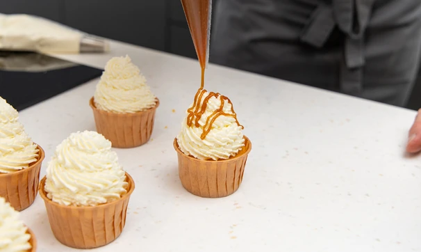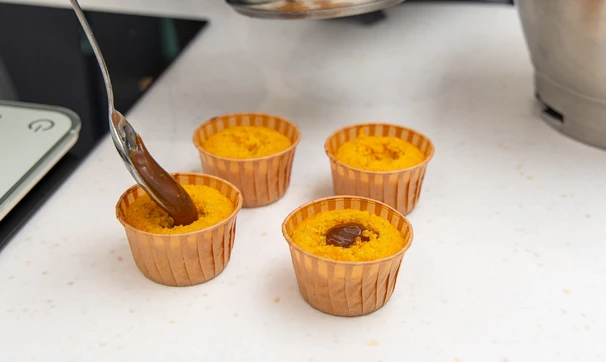 У готовых остывших капкейков выньте с помощью чайной ложки немного теста из центра каждого и залейте в углубления карамель.