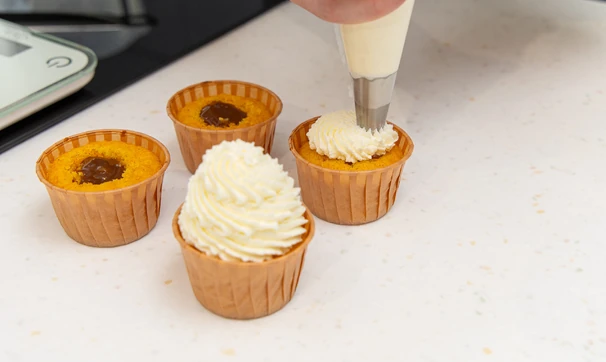 Переложите крем в кондитерский мешок с насадкой «звезда» и сделайте шапочки на капкейках.