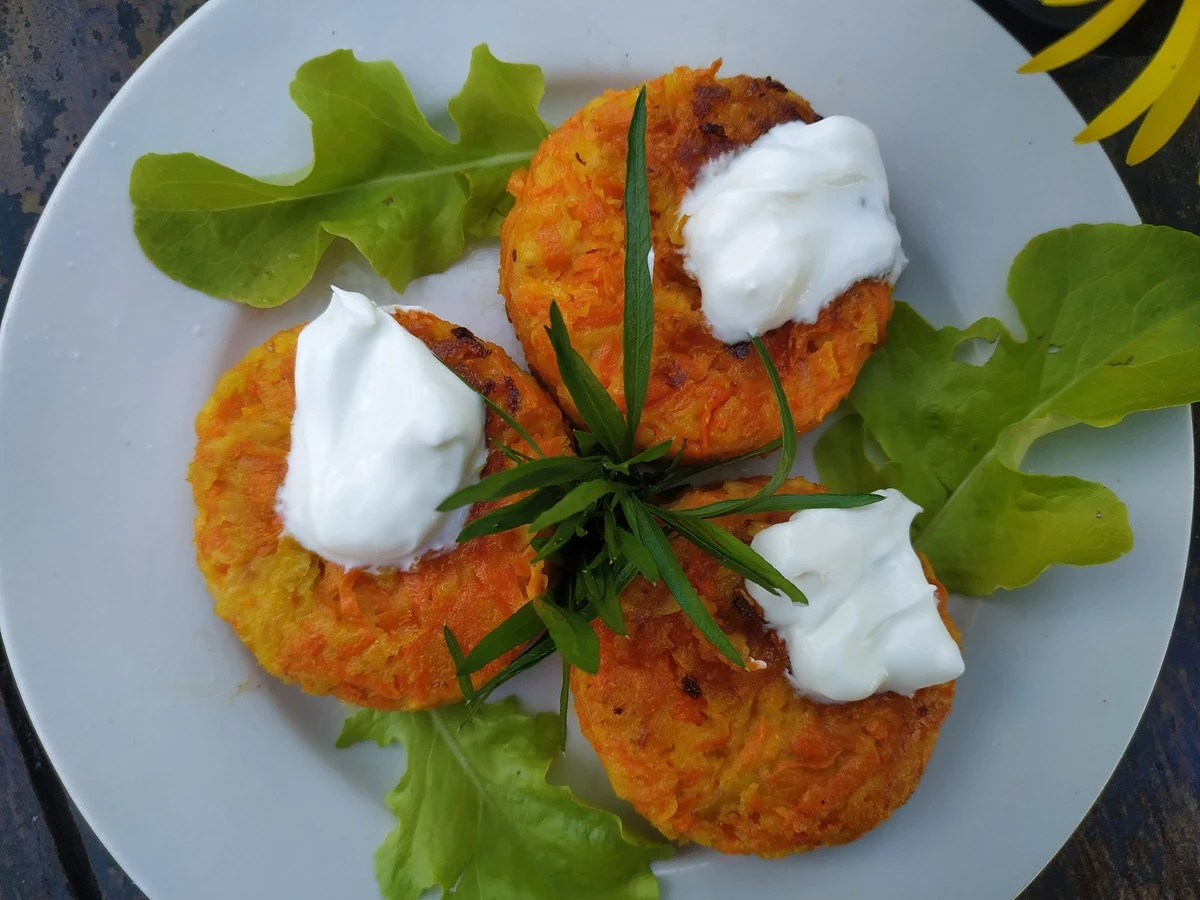 Подавайте морковные котлеты со сметаной и зеленью.