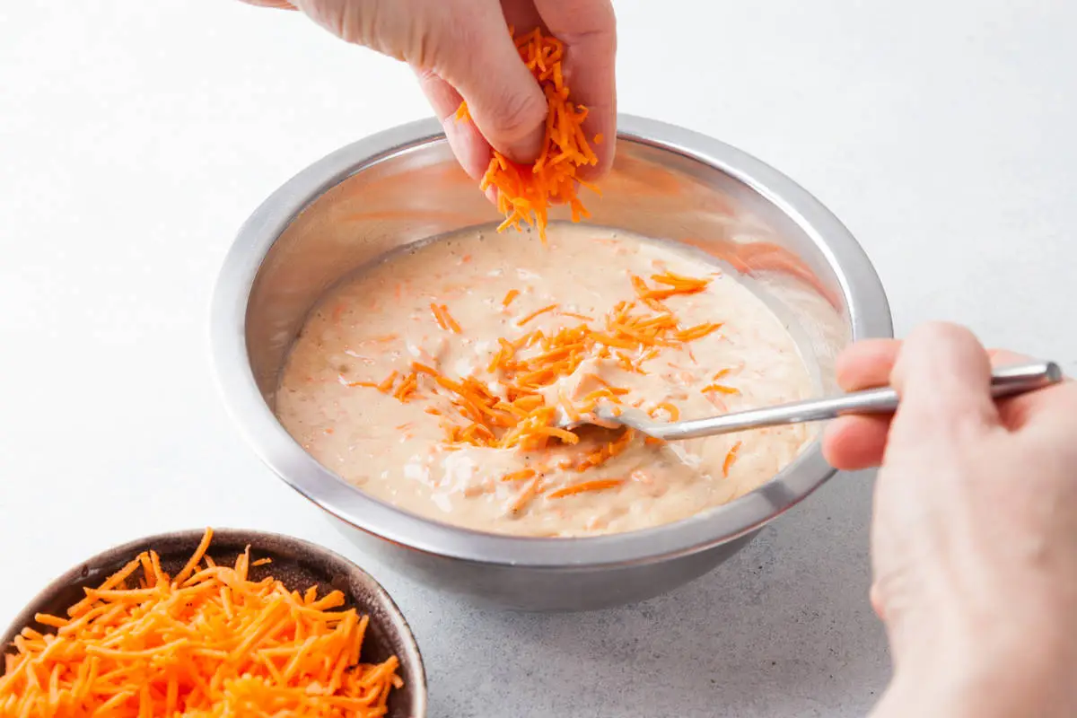 Порциями всыпьте в яичную массу муку, все специи, грецкий орех, оливковое масло и морковь. Для более воздушного коржа вместе с мукой добавьте соду (при желании погашенную уксусом).