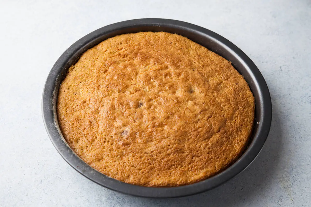 Смажьте форму для выпекания коржей оливковым маслом, присыпьте мукой или манной крупой, выложите половину теста. Выпекайте корж при 180°С в течение 30-35 минут и проверяйте готовность при помощи зубочистки. Всего нам потребуется два коржа. Можно выпекать их одновременно в двух одинаковых формах или использовать одну для всего теста сразу, а затем разрезать корж пополам.