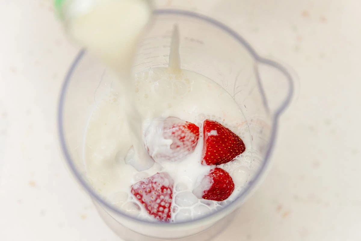 Пробейте клубнику вместе со сгущёнкой и молоком в блендере. Необязательно добиваться однородности, можно оставить часть ягод кусочками.