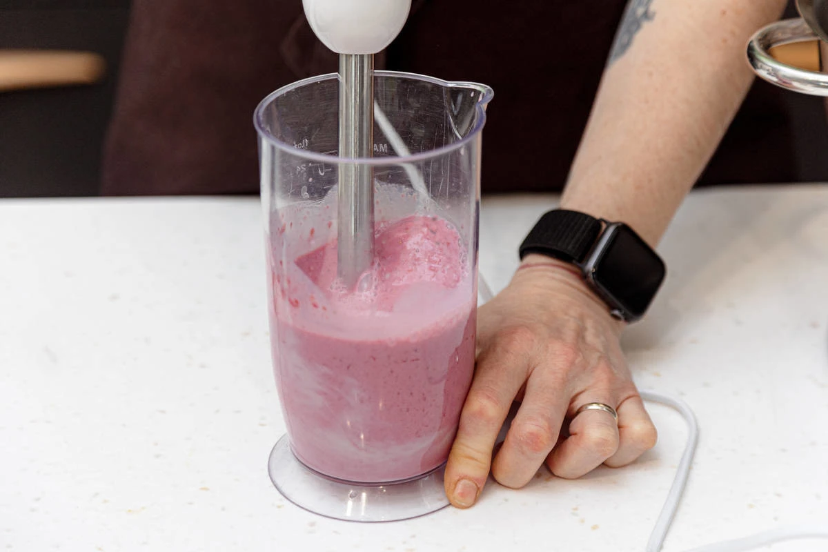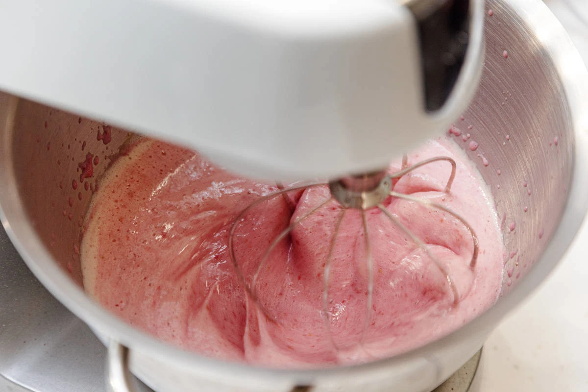 Соедините молочно-клубничную смесь с яичной, взбейте всё вместе миксером.