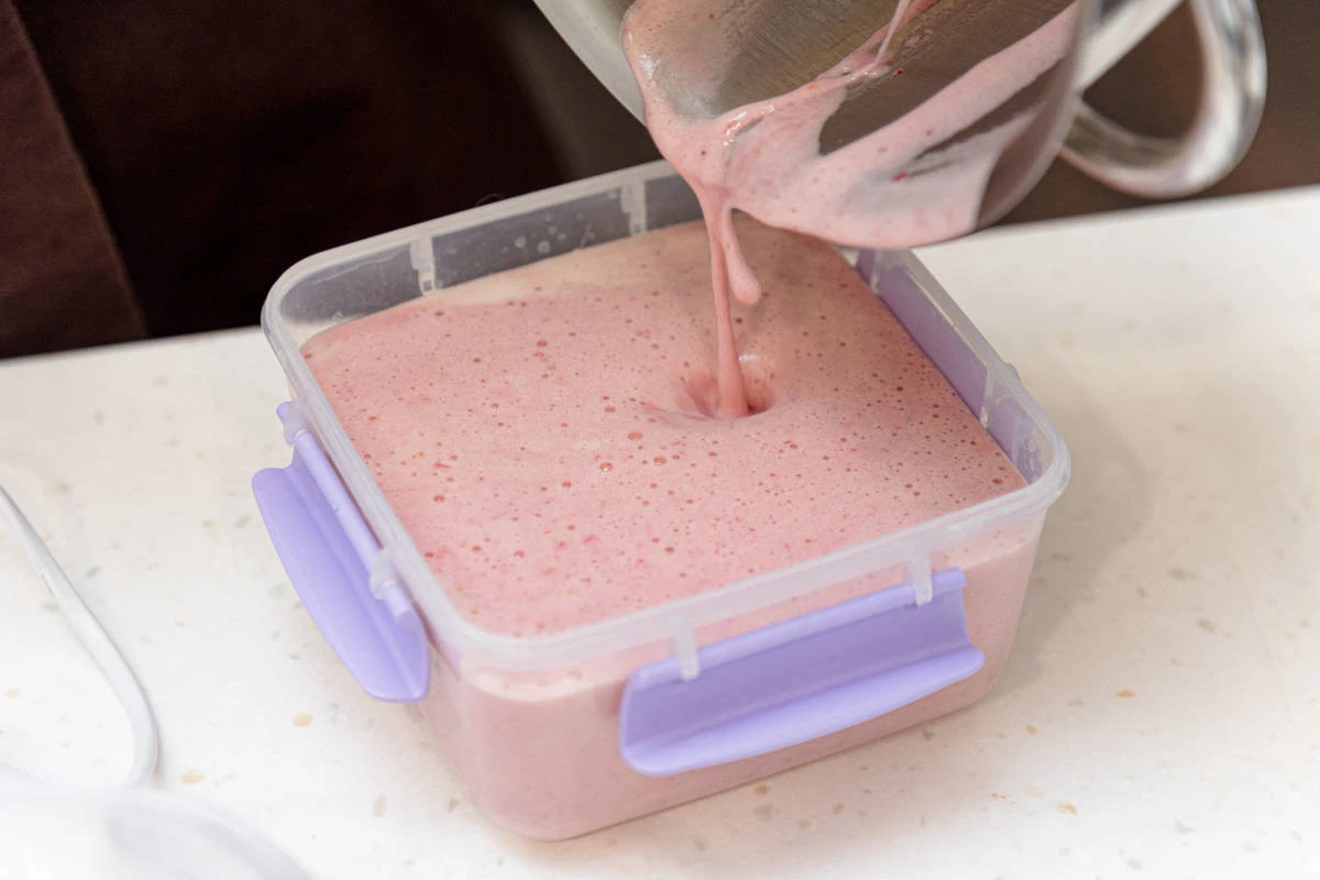 Залейте смесь в контейнер с крышкой или в зиплок-пакет и уберите в морозильную камеру с максимально низкой температурой (желательно включить режим шоковой заморозки, если он есть).