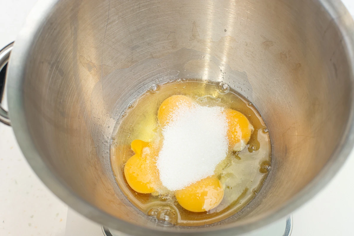 Разбейте в чашу миксера яйца и насыпьте сахар. Взбейте в пышную пену.