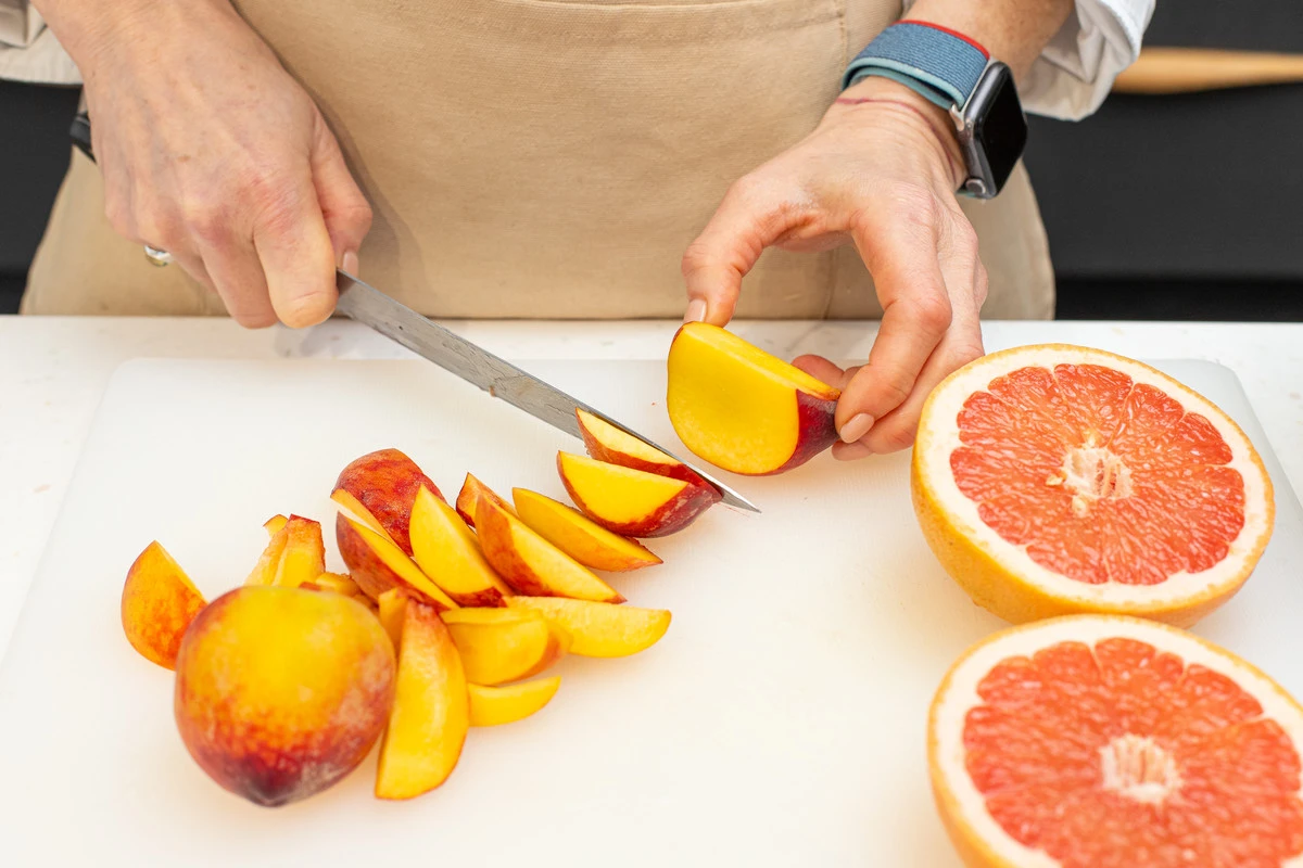 У персиков удалите косточки и нарежьте мякоть кусочками.