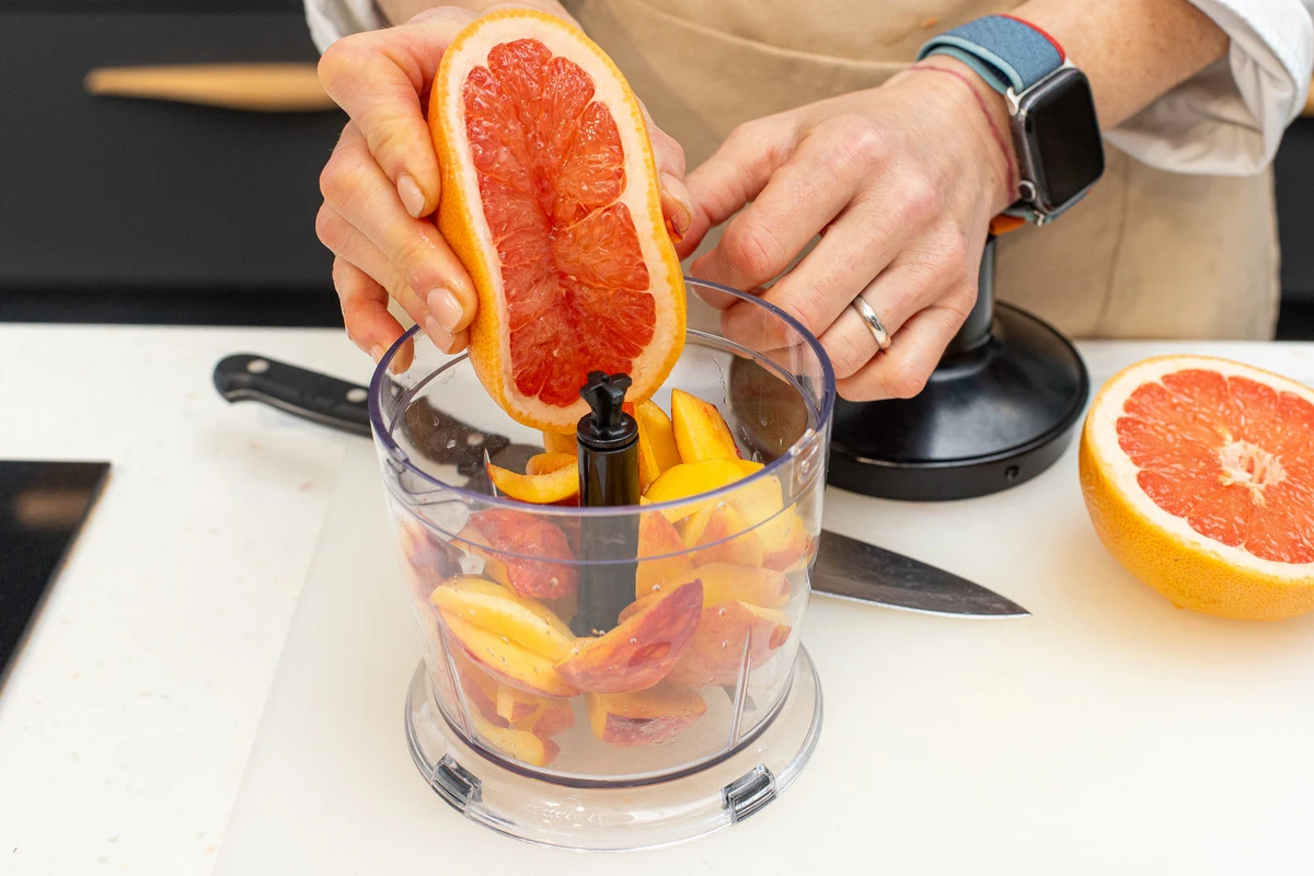 Из грейпфрута выжмите сок. Положите персики в чашу блендера, влейте грейпфрутовый сок и измельчите всё вместе до однородности.